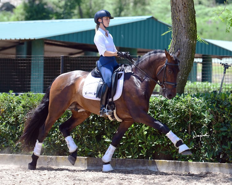 Destinado is a striking horse both in appearance and movement. His sire, Nazareno LXVIII, who belongs to our stable, was named JRR in Dressage and is a son of Utrerano VII, an Elite stallion of the breed. He possesses excellent natural gaits, performs well in exercises such as zig-zag half-pass and pirouettes, and is well-introduced to dressage exercises such as piaffe and passage, as you can see in the video. The flying changes are the only movement he finds challenging to execute. When he was younger, he competed in the 4- and 5-year-old categories, including at SICAB, consistently earning scores mostly above 70%, and even reaching scores over 78%. Destinado has a noble temperament, is always eager to work, and is very energetic. He has experience in outdoor rides and displays a very good character. Its reccomeneded for experienced riders who are looking to keep learning and enjoy the experience that this talented horse could give you.
