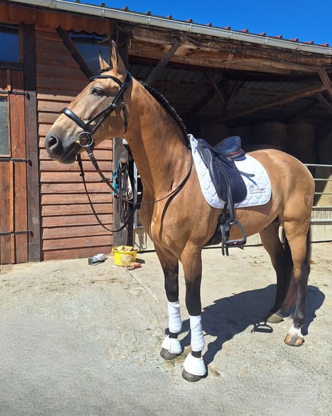 Dolar JC ha 10 anni e misura 1m63. Il suo IGG è stato valutato al 107% durante concorsi di morfologia in Spagna. Sua madre proviene dal famoso allevamento Peralta! Oltre alle sue origini, Dolar presenta una vera facilità sotto la sella. Molto ben addestrato, padroneggia i movimenti di alta scuola: cambi di piede a due tempi, passage, piaffer, passo spagnolo, approccio alla pirouette. È un cavallo sensibile e affettuoso, generoso sotto la sella e curioso nell'interazione. Il partner sportivo ideale per un/a cavaliere/cavaliera desideroso/a di perfezionare il proprio dressage sviluppando al contempo una relazione esclusiva con questo cavallo così fine e raffinato quanto espressivo. Il suo bilancio radiografico è perfetto, disponibile su richiesta. Come tutti i cavalli che entrano a far parte di Alegria, Dolar è educato secondo il curriculum della Relazione di Complicità®, il nostro metodo di educazione che garantisce sicurezza e serenità. È possibile prenotarlo fin da subito e proseguire il suo sviluppo con il nostro supporto presso il maneggio o grazie alla nostra formazione online. Prezzo su richiesta, variabile in base all'educazione del cavallo.