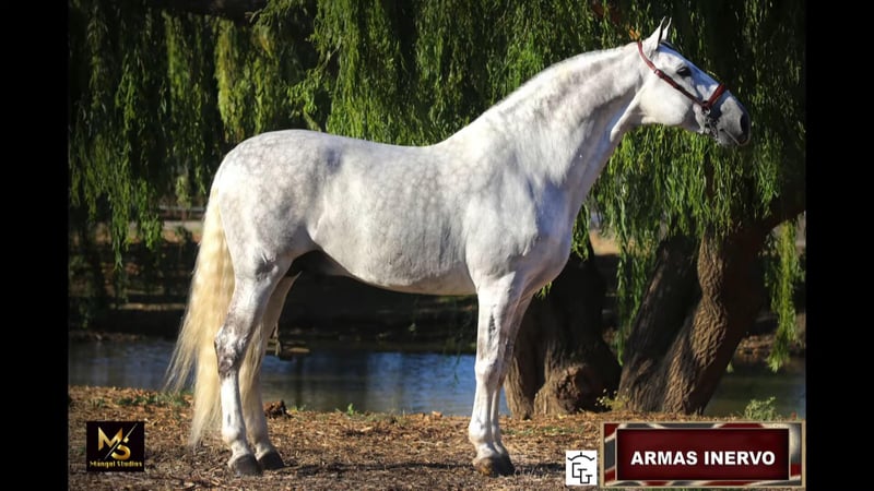 ARMAS INERVO embodies the pinnacle of excellence from the renowned breeder FLORENCIO MORENO MORENO. This majestic international champion stallion is linebred from the legendary Yeguada PLAZA De ARMAS, a cornerstone of elite Spanish dressage bloodlines. He also carries the prestigious lineage of Judio VII (Yeguada Villaire). With a breathtaking genetic index score of 114.91, INERVO stands as a paragon of the Pura Raza Española (PRE) breed, radiating power, elegance, and unparalleled presence. A decorated ANCCE champion in Spain - as Campeon Mundial, SICAB 2015, a champion of France and the United States, INERVO has dominated the show ring with limited yet illustrious appearances, securing his status among the breed’s finest. This awe-inspiring stallion is poised to elevate any breeding program or continue his ascent in the competitive arena. INERVO is your opportunity to own a living legacy, destined to leave an indelible mark on the world of PRE horses. Contact us to secure this extraordinary champion and create a breeding dynasty.