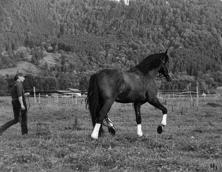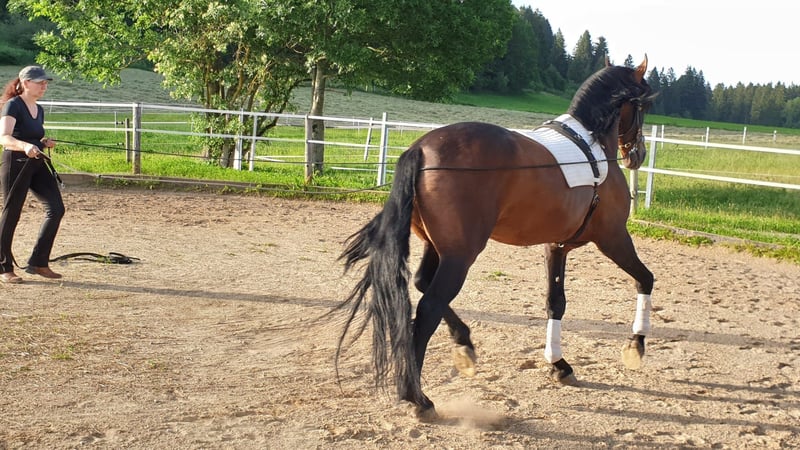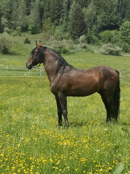Dream horse is looking for HIS person. When I was looking for a companion for my 4-year-old PRE stallion in May 2022, Estimado came to us, a then 13-year-old, 170 cm tall PRE stallion with a handicap. Estimado had a breeding accident two years prior, and a diagnosis was unfortunately only made with us: spinal ataxia. Since it was already too late at that point to treat the nerve damage medically, I started to gymnasticize him with lunging, double lunging, groundwork, and long walks to bring him as much as possible into balance. In the meantime, I ride him occasionally at the walk. However, Estimado is not just a companion horse. He wants to work, he wants HIS person, for whom he is ready to give everything and be further developed. I wish for him a person whose focus is not on riding, but who especially enjoys spending time with him on walks in the countryside, where he passes tractors, children, cyclists, and cars without spooking, and has a great time with groundwork, and who has the opportunity to keep this horse with a heart of gold and a dream character as a stallion. He does not need medication, but he does require daily turnout and movement. He gallops very confidently in the pasture, rolls, and can get up very well when lying down. I can imagine him well with a calm gelding. If you are seriously interested in this truly wonderful horse, I look forward to hearing from you.