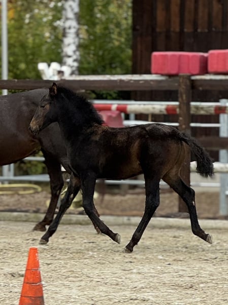 Quinteto, our eighth foal born this year, has arrived. He is a beautiful bay, now sporting a sleek dark bay coat for the autumn, with no markings at all. He has a very classic, noble head. His temperament is very relaxed and always friendly. He is very attentive to humans, curious in character but not intrusive. He has mastered the basics of foal handling, such as haltering, hoof handling, and leading a little. His movement, as expected from his excellent pedigree, is lively and noble. He displays a beautiful, rhythmical trot and a very elegant, well-balanced canter. His mother, Libelula, is a mare of the old, classical type, in a chocolate color—impressive, beautiful, and clever! His sire is the outstanding breeding stallion Crisonto GG, who is himself a progeny of the elite stallion Cacique. His movement has been proven to be outstanding! Quinteto is of a middle-ranking but has been completely trouble-free with all our foals since birth. It is worth seeing him; he will grow into a very good, reliable horse that will surely meet the expectations of even the most ambitious rider. For Quinteto, as for all our horses, our primary wish is to find a kind person with a sense of responsibility, who handles both the horse and themselves with care and patience. Our horses are completely unspoiled and have only had positive experiences.