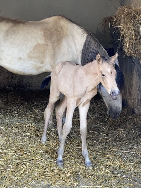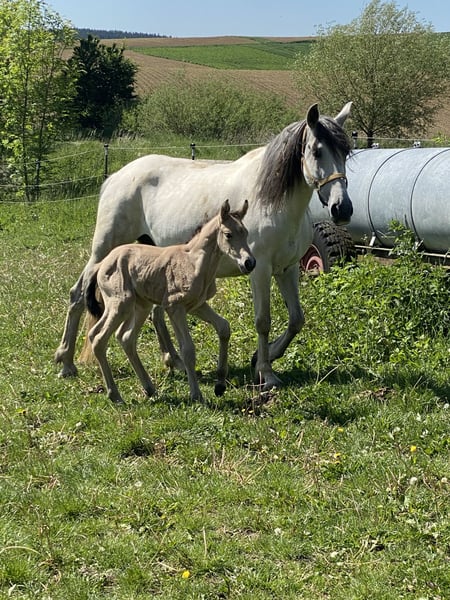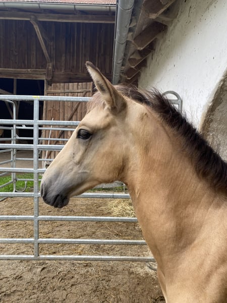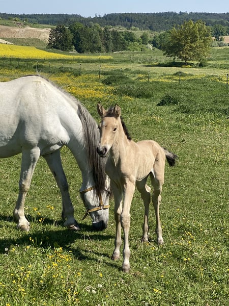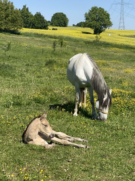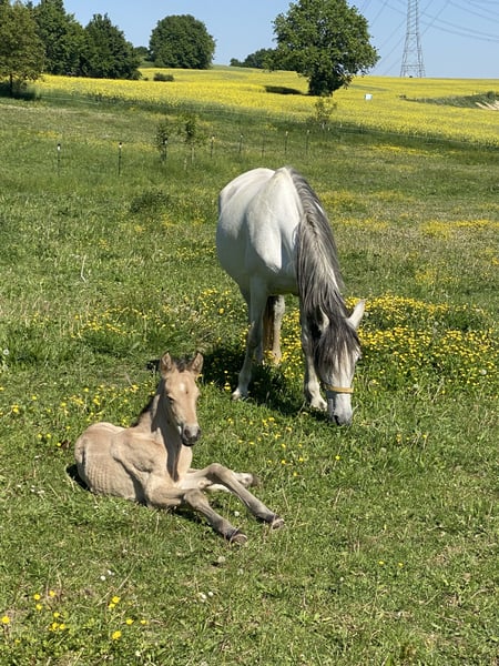 Lobito, a dream foal from our breeding, is looking for his new favorite person after weaning. Lobito not only has a beautiful color, but he is also very elegant and moves exceptionally well. Unfortunately, we cannot keep them all, and so he is sadly for sale. With this sunshine, you will always have a smile on your face and a friend for life. He is growing up in a species-appropriate herd environment and lives in an open stable. The last two pictures show his father.