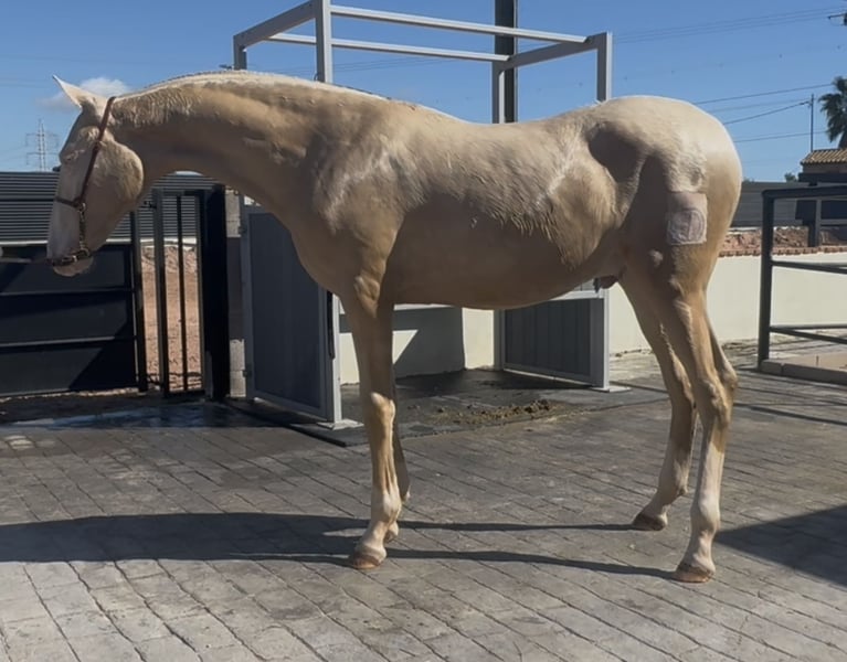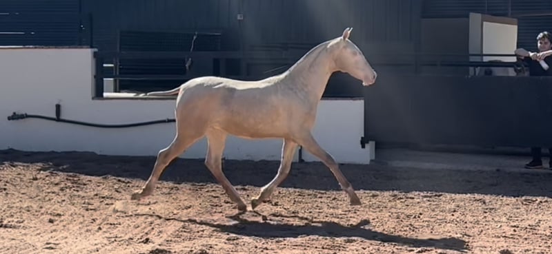 Excellent opportunity to acquire a future top P.R.E. stallion — perlino, with a striking face and a quateral coat, the most exclusive in diluted color. The foal has just turned 9 months old, with a very good conformation — strong and broad, with good proportions and soundness. His movements are highly expressive and artistic, indicating a promising future in haute école and performances, as well as for working equitation, breeding, and as a sire to establish a breeding program. He is sired by Inedit II, a cremello stallion standing at 1.73 meters. Located in Castellón, near Valencia, Spain.