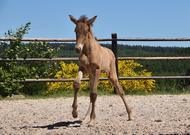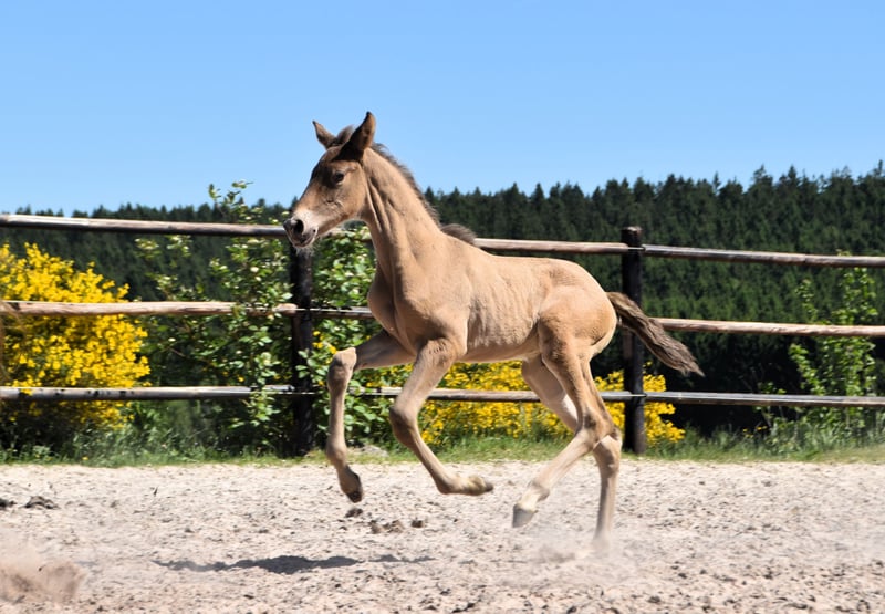 Dieser außergewöhnliche Hengstfohlen ist ein auffälliger Doppelperle (Isabelo) PRE, geboren am 1. Mai 2025, aus Duquesa CCCLXII und Maestrante PM. Er ist ein mütterlicher Enkel des renommierten Pearl of Peace EV, einer Linie, die für Qualität und Präsenz bekannt ist. Sein Vater, Maestrante PM, ist unser beeindruckender Doppelperle-Hengst, der 1,71 m groß ist. Maestrante gibt seinen Nachkommen konstant substanzielle Knochen, ausdrucksvolle Bewegungen und natürliche Elastizität weiter. Neben seinen physischen und konformationellen Qualitäten, die ihn ideal für die Dressur geeignet machen, ist Maestrante für sein unkompliziertes, großzügiges Temperament in jeder Situation bekannt. Maestrante PM hat zweimal an der Europäischen Zentralmeisterschaft teilgenommen und 2022 eine Bronzemedaille in der Klasse der Hengste über 7 Jahren gewonnen sowie 2023 Gold für Funktionalität (gerittene Prüfung für Hengste ab 7 Jahren) gewonnen. Er ist im PRE-Stutbuch eingetragen und vollständig farbgenetisch getestet. Dieses Fohlen trägt nicht nur seltene und begehrenswerte Farbgenetik – es zeigt auch eine echte Begabung für die Dressur. Es zeigt bereits drei klare, gut ausbalancierte Gangarten und demonstriert eine ruhige, neugierige und aufmerksame Natur. Mit seinem ausgezeichneten Temperament und seinen vielseitigen Fähigkeiten wäre er auch perfekt für Ausritte, Working Equitation oder Freizeitreiten geeignet.