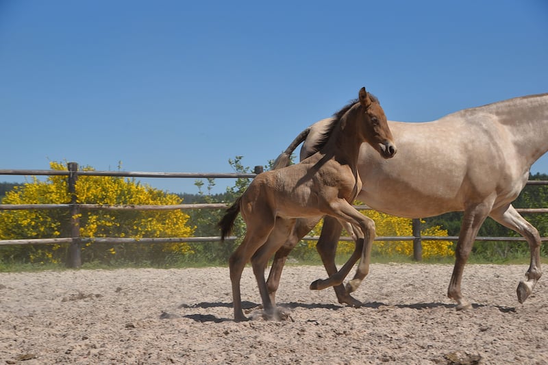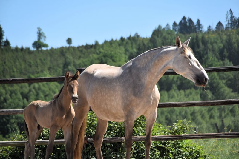 Deze uitzonderlijke hengstveulen is een opvallende dubbele parel (isabelo) PRE, geboren op 1 mei 2025, uit Duquesa CCCLXII en Maestrante PM. Hij is een materne kleinzoon van de beroemde Pearl of Peace EV, een lijn die bekend staat om zijn kwaliteit en aanwezigheid. Zijn vader, Maestrante PM, is onze indrukwekkende dubbele parel hengst, met een hoogte van 1,71 m. Maestrante geeft consequent een stevige botstructuur, expressieve beweging en natuurlijke elasticiteit door aan zijn nakomelingen. Naast zijn fysieke en conformational kwaliteiten, die hem bij uitstek geschikt maken voor dressuur, wordt Maestrante geprezen om zijn gemakkelijke, genereuze temperament in elke situatie. Maestrante PM heeft tweemaal deelgenomen aan het Europese Centraal Kampioenschap, waar hij in 2022 een bronzen medaille won in de hengstenklasse boven de 7 jaar, en in 2023 goud won voor functionaliteit (bereden proef voor hengsten van 7 jaar en ouder). Hij is geregistreerd in het PRE-stamboek en volledig kleur getest. Dit veulen draagt niet alleen zeldzame en gewilde kleurgenetica, maar toont ook oprechte aanleg voor dressuur. Hij vertoont al drie duidelijke, goed gebalanceerde gangen en laat een kalme, nieuwsgierige en attente aard zien. Met zijn uitstekende temperament en veelzijdige vaardigheden zou hij ook perfect geschikt zijn voor buitenritten, werkende equitatie of recreatief rijden.