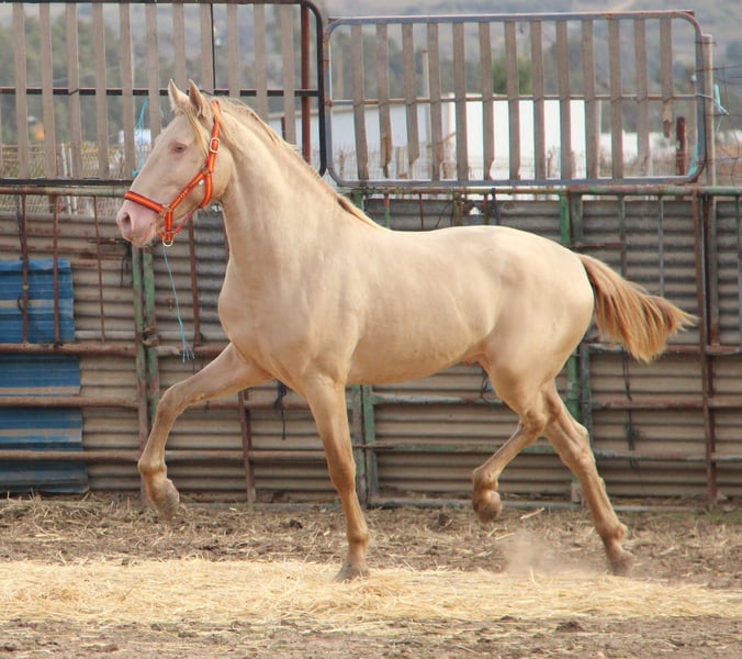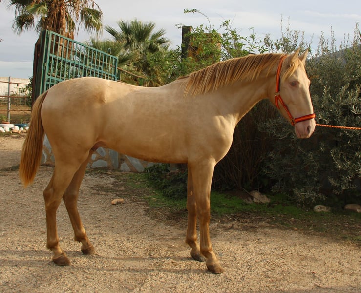 Dorado es un potro de 2 años y medio, inscrito en ANCCE y sometido a prueba de genealogía. Anteriormente se le registraba como Perlino, pero actualmente su color se clasifica como Baya Perla. Tiene un carácter amable, es claro de mente y muy sociable con las personas. Como todo potro joven, a veces puede tener sus pequeñas travesuras, pero siempre es manejable sin problemas. Dorado proviene directamente del criador y hasta casi los 2 años pudo criarse en una manada de sementales. Conoce la cuerda y ya se le ha puesto alguna vez una silla de montar. Si buscas un caballo especial para desarrollarlo tú mismo, este hermoso muchacho es la opción perfecta. A petición, Dorado puede quedarse con nosotros para su entrenamiento. Se puede solicitar un examen clínico completo (AKU). El transporte se organiza a nivel internacional. Videos disponibles bajo solicitud.