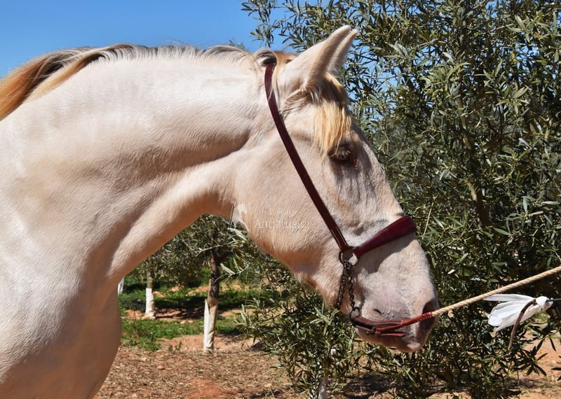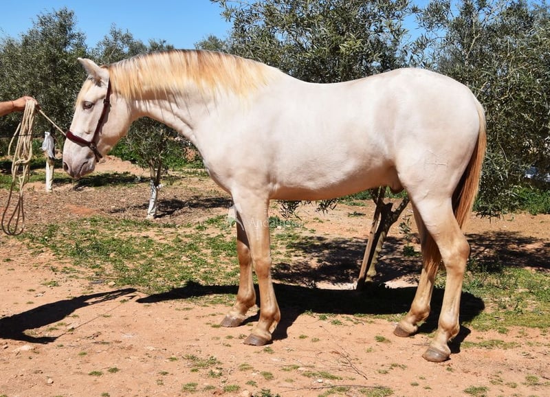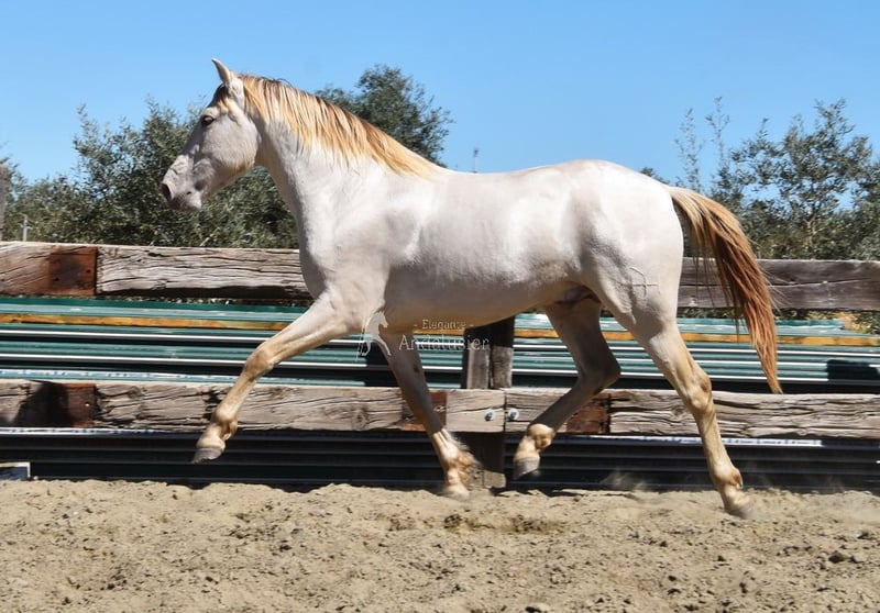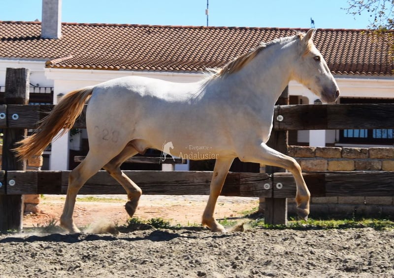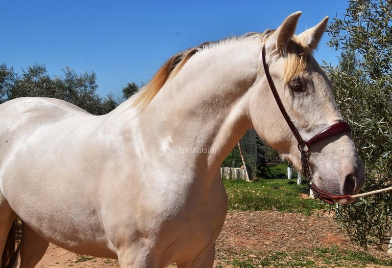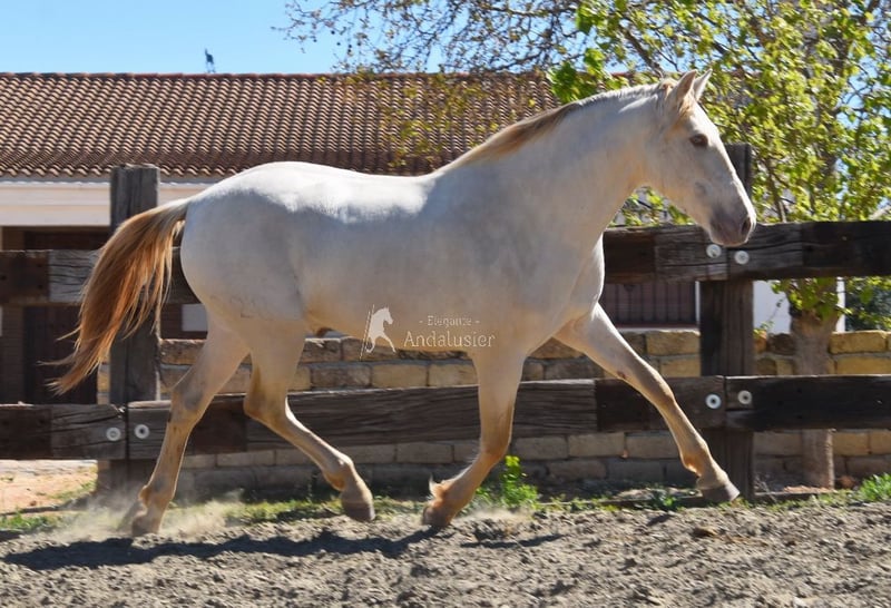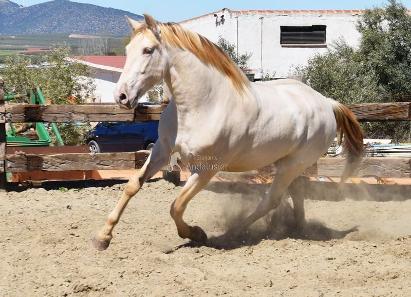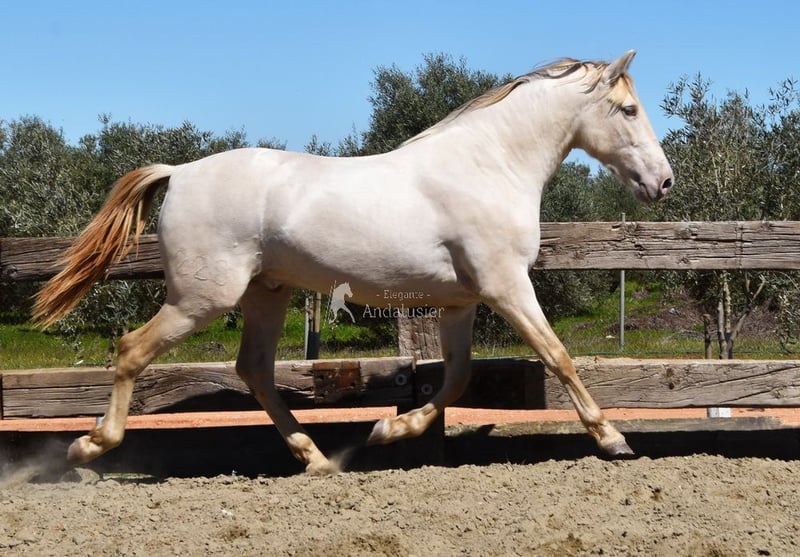 Uprzejmy charakter, surowy, niedawno zrolowany, wysoki, barokowy, dobre ruchy i pochodzenie, wyjątkowy kolor, Bayo Perla z dokumentami PRE, pochodzenie: Torreluna, Millan Herce, Ganadería Antares, Yeguada Militar, posiada wiele wybitnych przodków. www.elegante-andalusier.com