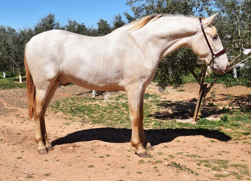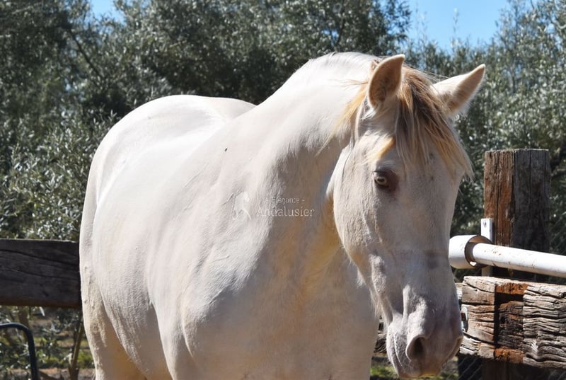 Caractère doux, un peu sauvage, récemment mis en pension, grand modèle, baroque, bonnes allures et excellente lignée. Couleur particulière : bai perlino avec papiers PRE. Origines : Torreluna, Millán Herce, Ganadería Antares, Yeguada Militar. Plusieurs ancêtres qualifiés dans sa généalogie. www.elegante-andalusier.com