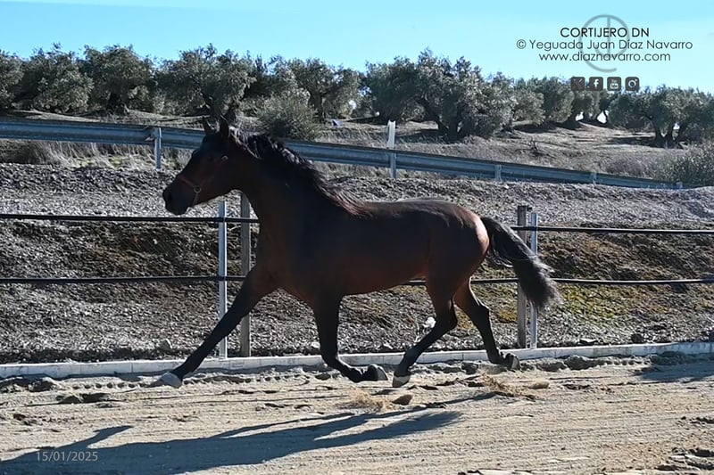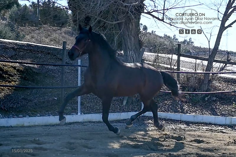 Intelligent colt with very good character. Working under saddle with cinchuelo and fixed rein. Shortly, small rides. Three good gaits. Lines: Velero XI, Rumex, Corzo IV, Obcecado, Levitón, Llamativo II, Ulster. Ventura Camacho, Granda, Yeguada Militar, Vizconde de la Montesina, Urquijo, D. Benito Zoido, Bohorquez.