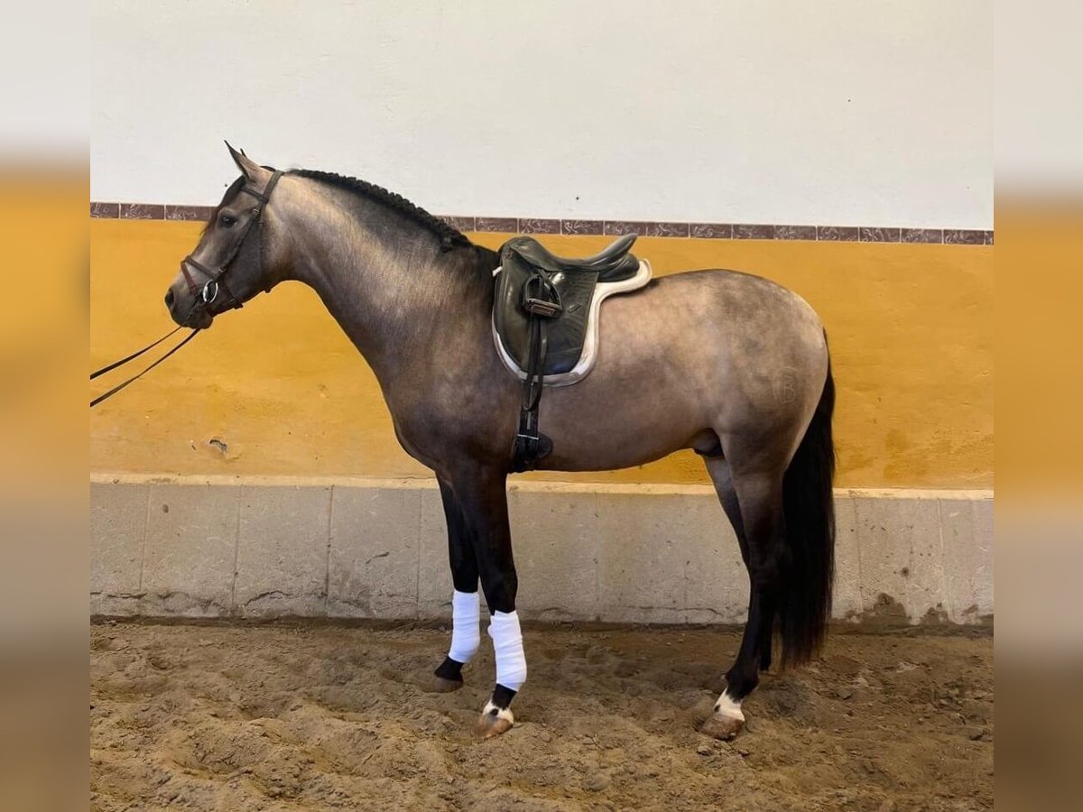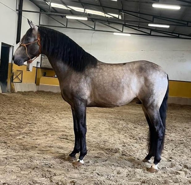 Wij waren echt onder de indruk van deze veulen en, eerlijk gezegd, heeft hij ons verrast. Het was lang geleden dat we zo'n uniek voskleurig veulen zagen, met goede bewegingen en bovendien een karakter dat je zowel van binnen als van buiten raakt. In dagelijks gebruik, in hand, is hij gewoonweg geweldig: vertrouwelijk, dichtbij en respectvol. Het is duidelijk dat de zadelmakheid met veel zorg, zachtheid en respect is gedaan. Onder het zadel blijft hij in hetzelfde spoor. Hij luistert goed naar de ruiter en reageert zeer goed op de hulpen. En ondanks slechts enkele maanden training begrijpt hij meteen wat er van hem gevraagd wordt, zonder zich te laten opfokken. Het is echt een zeer brave, makkelijke en comfortabele paard. Fysiek gezien is hij zeer knap en goed gebouwd, met zeer goede gangen en balans. Hij is ideaal voor dressuur, amateur of working equitation, en je kunt hem ook overal mee naartoe nemen voor een rit, omdat hij niet bang is in nieuwe omgevingen. IberHorse: al meer dan 14 jaar selecteert Iberische paarden volgens strenge normen voor internationale ruiters. Als dit profiel bij jou past — een heel rustige, coöperatieve voskleurige hengst met kwaliteiten voor dressuur voor amateurs of working equitation — neem dan contact met ons op voor een afspraak of kom hem persoonlijk ontmoeten.