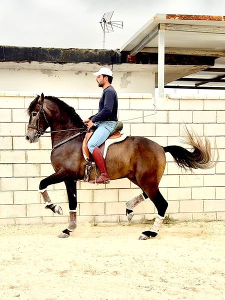 Este joven semental cautiva con su carácter cariñoso. Siempre está motivado y ya conoce piaffe, paso español, el compliment (clásico y portugués) y la posición en silla. Su carácter cercano a las personas facilita y hace el entrenamiento más ameno y lúdico. También es muy confiable en paseos en campo y en tráfico urbano. Se disponen de radiografías y pueden ser consultadas. Para más información, no dudes en contactarnos por WhatsApp al 0175 861 45 35.