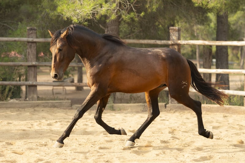 PRIMERO is a stunning dark bay PRE stallion, 3.5 years old, with wonderful fundamental gaits. He stands approximately 1.64 meters (16.1 hh), showcasing a baroque yet elegant build. He will be perfectly suited for leisure riding, dressage, and working equitation. An ideal family horse and a true teddy bear. He is currently still part of a herd and is growing up in a natural environment. I look forward to your inquiry: +49 171 528 48 65