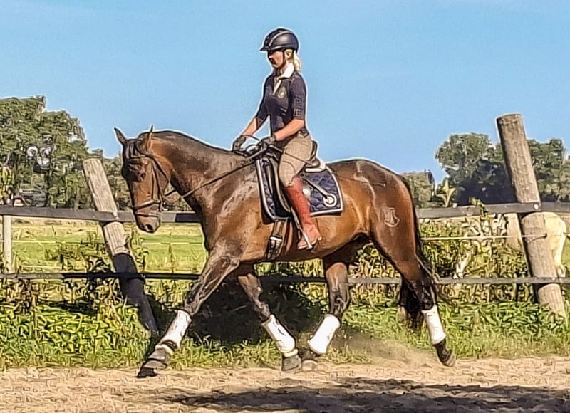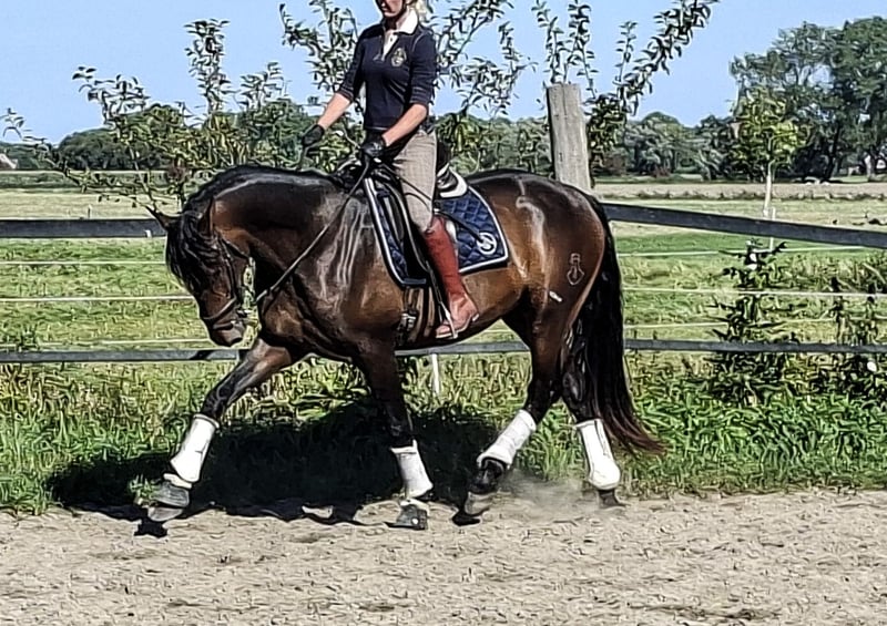 Benicio is certainly not the typical baroque type of a PRE. He is tall, angular, has a very distinctive face, and is rather long-legged. Essentially, he is a blend of a Warmblood and a PRE. This is remarkable considering he comes from very traditional PRE bloodlines, all of which originate from renowned Spanish studs, but in this case, they all share one common trait: they breed functional horses. Benicio has an exceptionally expressive walk—one of the best you’ll find in a PRE. It combines both freedom of movement and cadence perfectly. His canter is large, uphill, and already well-balanced, even though Benicio has not been ridden for very long. Lateral work in trot comes easily to him; he simply has a lot of power in his hindquarters. Despite his strength, Benicio is always easy to control. He is just a very nice horse, which is why we all love him. He is always striving to do his best and to please. A horse you can enjoy riding for fun. If you're looking for a PRE with the character of a good-minded horse and the movement ability of a Warmblood, Benicio is the perfect match. Benicio was born and raised in Germany. The Ducal Stud is one of the largest PRE breeding farms in Germany and specializes in dynamic, expressive PREs. Several of his offspring have already achieved success in national and international competitions. You can also find more information about Ducal Stud online.