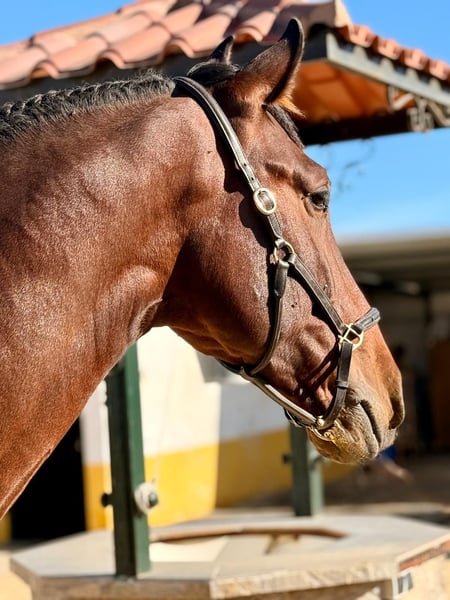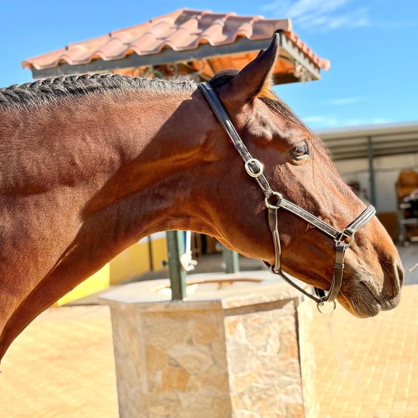 This exclusive PRE dressage stallion is for sale! This dark bay beauty not only impresses with his imposing appearance but also with his excellent character. With a height of 1.72 m, he is ideal for taller/stronger riders. The young stallion shows enormous potential in dressage and is ready to reach new heights with the right rider! Orquideo grew up at our stable and has been gently trained. On a snaffle bit, of course! He has three excellent basic gaits and has already been ridden at A level. Orquideo has already been successfully presented in the young horse test for 4-year-olds and immediately took first place! Orquideo has a great character and shows no stallion behaviour, even in a large, mixed stable! If you are looking for a promising young horse that impresses with both its looks and its abilities, then this PRE stallion could be just right for you. Of course, Orquideo comes from the very best breeding and has full PRE papers and the best pedigree! The El Ancla stud farm in Cádiz is currently a benchmark in PRE dressage and is particularly well known for the sporting achievements of its horses, such as Quincallero Ancla II at the World Championships for Young Horses and Guaro V, who won the Ancce Cup in the young horse category. Location: Spain – transport can be organized worldwide! Piro free & fully vetted!
