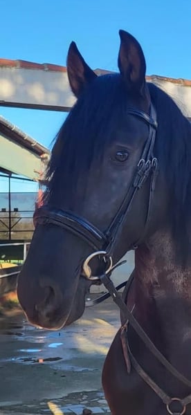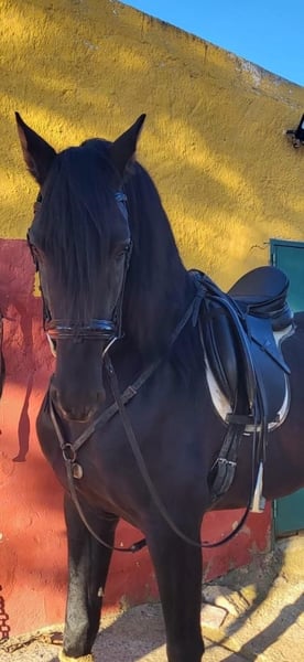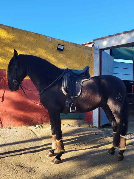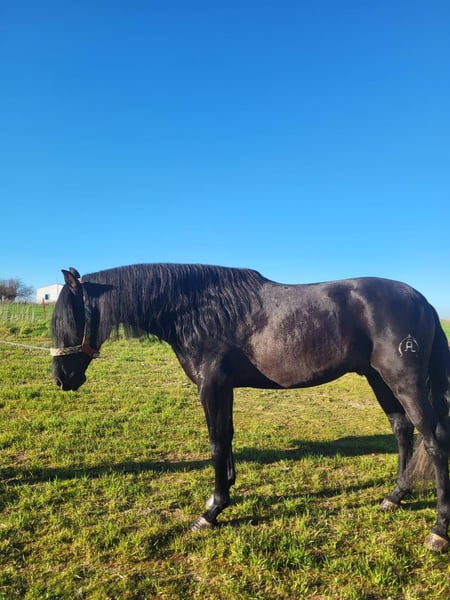 We are offering, in cooperation with our Spanish partner, a four-year-old black stallion with truly outstanding qualities. Triguero not only boasts a striking appearance but also possesses many traits desirable in a horse of his age. He is very people-oriented and always attentive when being trained. Under saddle, he is very alert and easy to handle. His childhood and youth were spent entirely appropriately on spacious pastures, living in a herd with other young stallions. His training was completely smooth, thanks to his positive temperament, carried out with great sensitivity and caution. He already moves confidently in all basic gaits, and even the "Spanish walk" poses no significant challenge for him. Throughout his life, he has had almost no opportunity to develop negative experiences. Due to his pedigree and temperament, he is also of interest to breeders. We are happy to answer any further questions you may have. The price is listed from Spain. We will gladly organize all necessary steps upon request. Please note: The sentence "Aufgrund seiner" appears incomplete; if you provide the rest of the sentence, I can complete the translation accordingly.