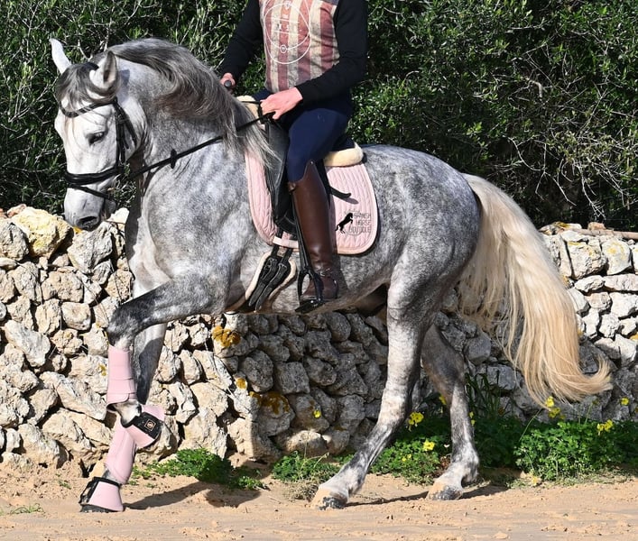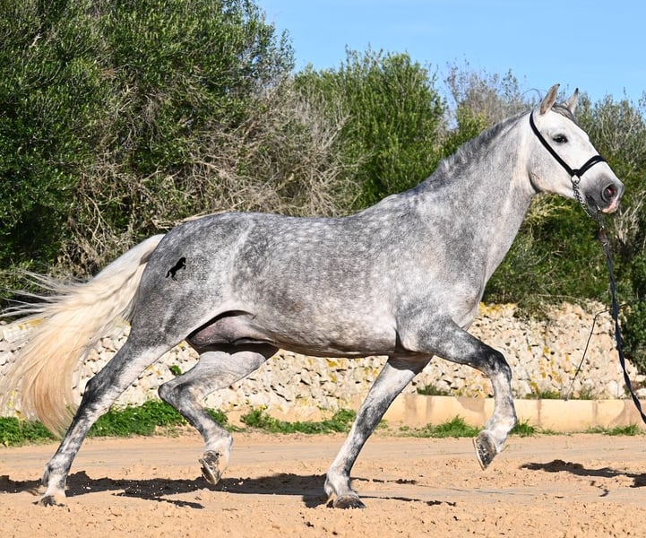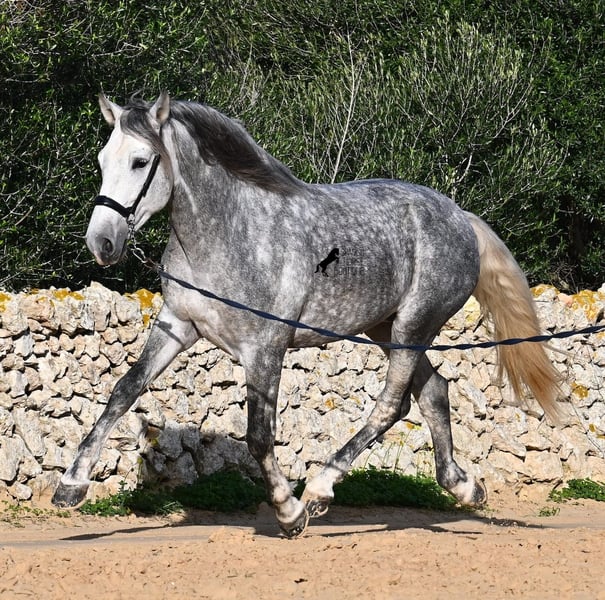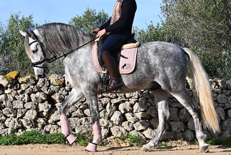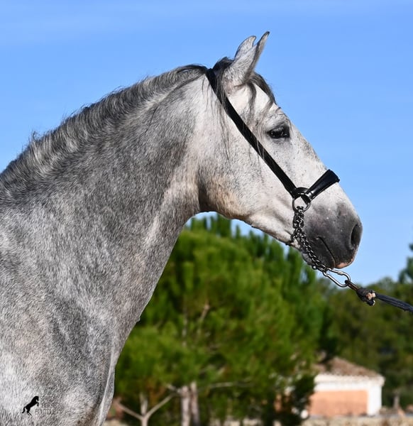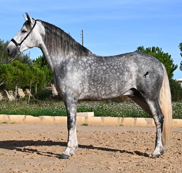 Este semental PRE nacido en 2021 (andaluz con certificación de raza de la ANCCE) es un pequeño tesoro de estilo barroco. Su propietario lo compró joven (en ese entonces también radiografiado, todo en categoría 1), pero lamentablemente es muy grande y el semental ha decidido mantenerse en un tamaño compacto. Hasta ahora ha recibido una formación básica a la jineta, con bocado de agua, pero por sus dimensiones, su dueño considera que es demasiado alto para un manejo correcto de las ayudas y ha decidido buscarle un nuevo hogar con alguien que tenga una complexión más adecuada. Este joven apuesto no solo es interesante como caballo de doma, sino también para criadores, ya que su linaje es excepcional. Es nieto de Datil VII de RETAMALES y por parte materna proviene de CAMPO BAJO, dos líneas que representan caballos de trabajo muy arraigadas. También encontramos en su ascendencia a PLAZA DE ARMAS y a la YEGUADA MILITAR (Cartujano). Bajo la silla ya se comienzan a trabajar las laterales y su conformación le favorece mucho, lo que también lo hace interesante para la disciplina de la Working Equitation. Su trote galopado es armonioso y cada vez aprende mejor a estirarse y a levantar la espalda. Le gusta ir al campo y el cambio de la pista de doma le ayuda a despejar la mente. Se encuentra en una paddock box, pero también está acostumbrado a pastar en libertad y a vivir en estabulación. Para quienes no puedan tener un semental, existe la opción de castración en el lugar. Con una altura actual de 1,57 m, se mantendrá compacto y en el estilo clásico del caballo español. Aún no ha sido utilizado para reproducción y está acostumbrado a estar cerca de yeguas. Precio acorde a su calidad. Su ubicación es en Menorca. Videos y pedigree disponibles a solicitud. Con gusto puedo organizar una inspección veterinaria, entrenamiento, castración, transporte o incluso su viaje si desea venir a verlo en persona. Para más detalles, consulte mi página o contactarme directamente. Saludos desde España