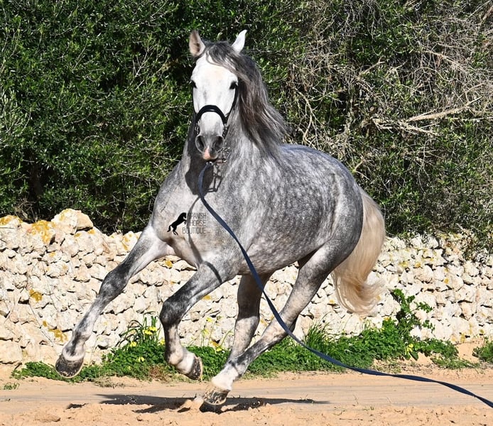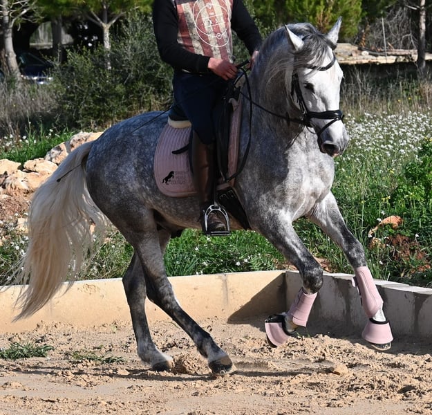 Dieser 2021 geborene PRE Hengst (Andalusier mit Rassenachweis der ANCCE), ist ein kleiner, barocker Schatz. Sein Besitzer hat ihn jung gekauft (damals auch geröngt, alles Klasse 1), doch leider ist er sehr groß und der Hengst hat beschlossen, im handlichen Format zu bleiben. So hat er nun eine basis-Ausbildung unterm Reiter genossen, auf Wassertrense, doch für korrekte Beinhilfen ist der Besitzer einfach zu groß und hat somit beschlossen, ihm ein neues Zuhause zu finden, bei jemandem, der auch körperlich besser passt. Der junge Schönling ist nicht nur als Reitpferd interessant, sondern auch für Züchter, denn seine Abstammung ist herausragend! Er ist ein Enkel von Datil VII von RETAMALES und mütterlicherseits ist er CAMPO BAJO gezogen, beides Linien die für sehr arbeitsame Linien stehen. Auch PLAZA DE ARMAS UND YEGUADA MILITAR (Cartujano) finden wir in seiner schönen Abstammung. Unterm Sattel werden schon laterale Arbeiten angefangen und sein Exterieur kommt ihm dabei sehr zu Gute, was ihn auch für die Working Equitation interessant macht. Seine Gallopade ist schön aufwärts und er lernt immer besser sich zu strecken und den Rücken zu heben. Ins Gelände geht er gerne und die Abwechslung zum Viereck ist auch super, um den Kopf frei zu bekommen. Er steht in einer Paddockbox, kennt aber auch Weidehaltung und reine Boxenhaltung. Für all jene, die keinen Hengst halten können, besteht natürlich auch die Option der Kastration vor Ort. Mit aktuell 157cm Stockmaß, wird er kompakt bleiben und im alten Typ des spanischen Pferdes. Er hat noch nicht gedeckt und kennt es, in der Nähe von Stuten zu sein. Preis der Qualität entsprechend. Sein Standort ist Menorca. Videos und Abstammung gerne auf Anfrage. Gerne organisiere ich vor Ort eine AKU, Beritt, Kastration, Transport oder auch ihre Reise, sollten Sie persönlich zum Anschauen kommen. Details dazu gerne auf meiner Seite oder im Gespräch. Saludos aus Spanien
