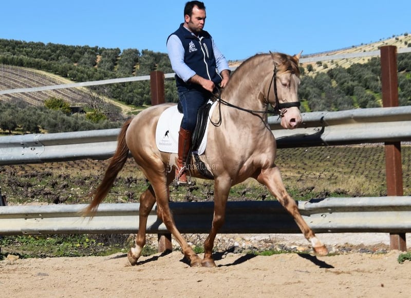 Ukochany, spokojny charakter, ciekawski, wesoły, przyjacielski, jeżdżony w podstawowych chodach, teren, duży, barokowy, wygodny, z certyfikatem, ogier reproduktor, wyjątkowy kolor, Baya Perla (CrPrl) z papierami PRE, dobre wyniki rentgenowskie i test na Piro negatywny, pochodzenie: Antonio Guiral Guarga, Castillo Villafranca, Paco Marti www.elegante-andalusier.com