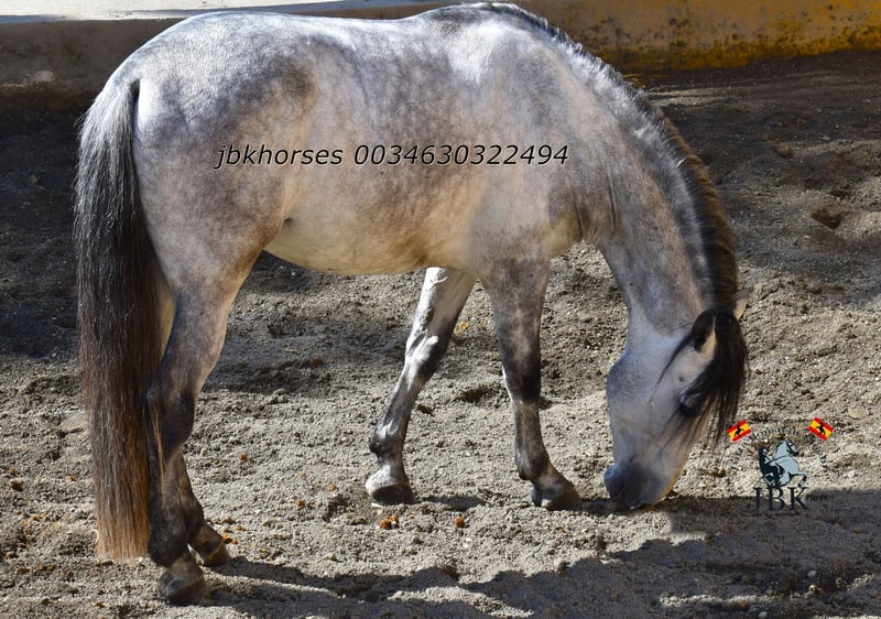 Le hongre PRE Abogado Arcos est né le 16.05.2021. Il a grandi en troupeau, a été mis au box à l'âge de 3 ans et est maintenant monté de manière solide et sûre dans les allures. Il connaît également de petites sorties à proximité. Un cheval qui travaille de manière solide et sérieuse. On ne peut attendre de lui aucune bêtise. Car son nom même représente la souveraineté. Abogado est un petit-fils de l'étalon Elite EDUCADO X de l'élevage Guardiola, Miura, Novales, Bariain, Muñoz et Terry complètent parfaitement la lignée.