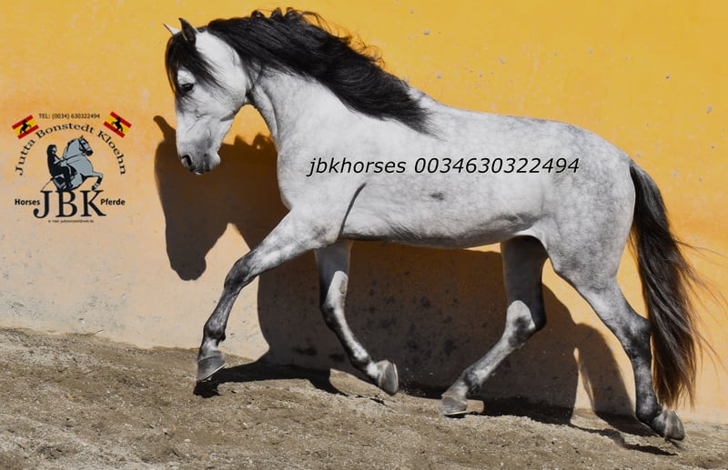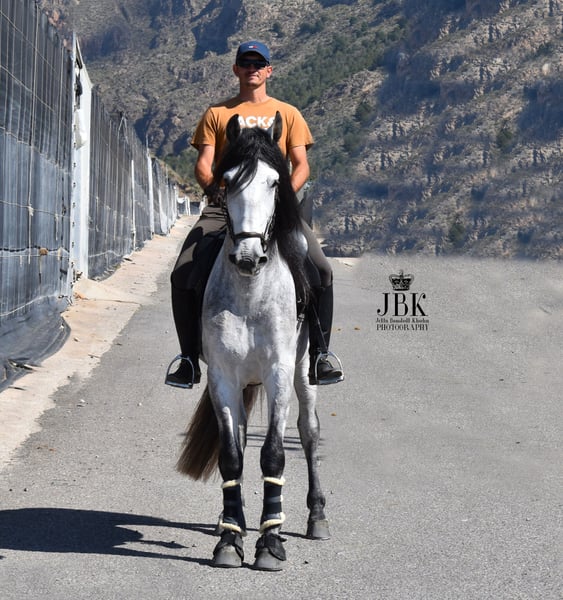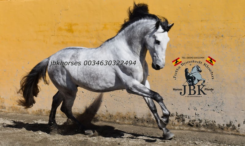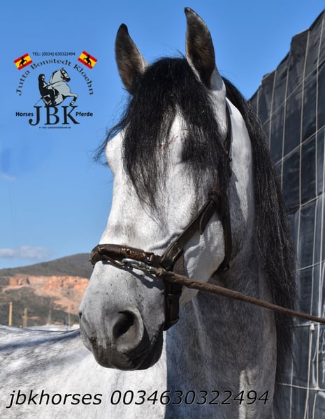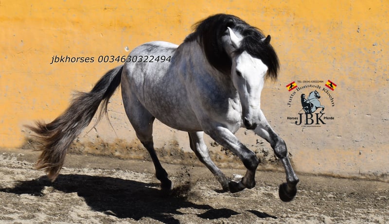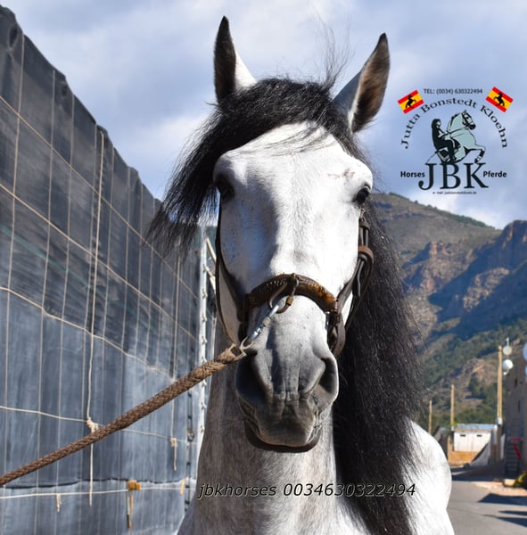 PRE stallion Abogado Arcos was born on 16th May 2021. He was raised in a herd and was stabled at the age of 3. He is now reliably and securely ridden in all gaits. He is also familiar with small outings around the corner. A horse that works solidly and earnestly. You can expect no nonsense from him. His name already stands for sovereignty. Abogado is a grandson of the elite breeding stallion EDUCADO X from the Guardiola breeding line. Miura, Novales, Bariain, Muñoz, and Terry perfectly complement his bloodline.