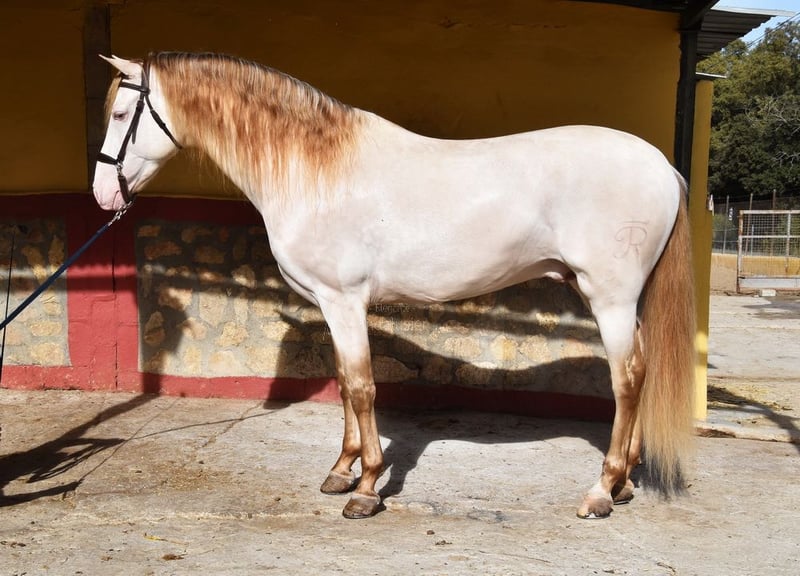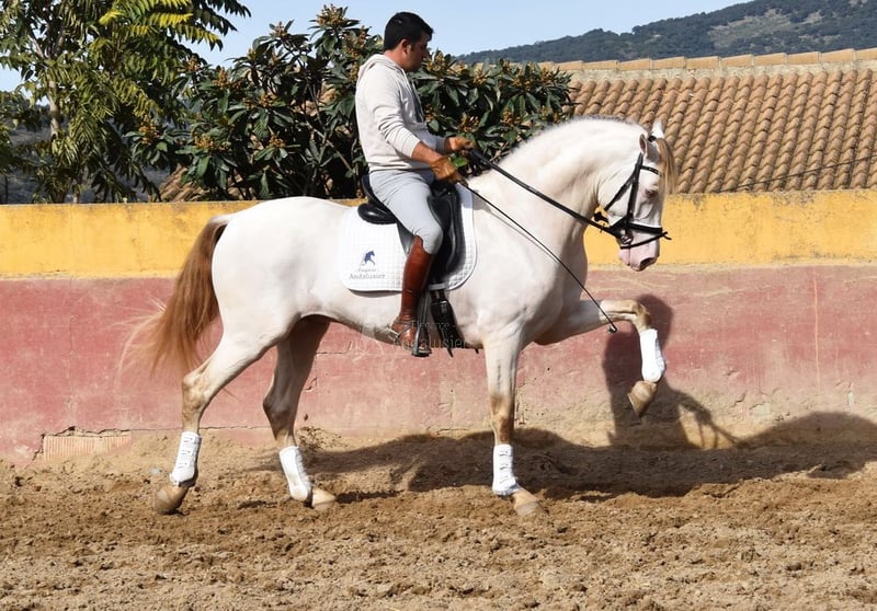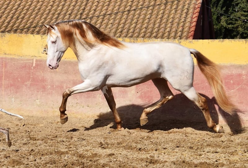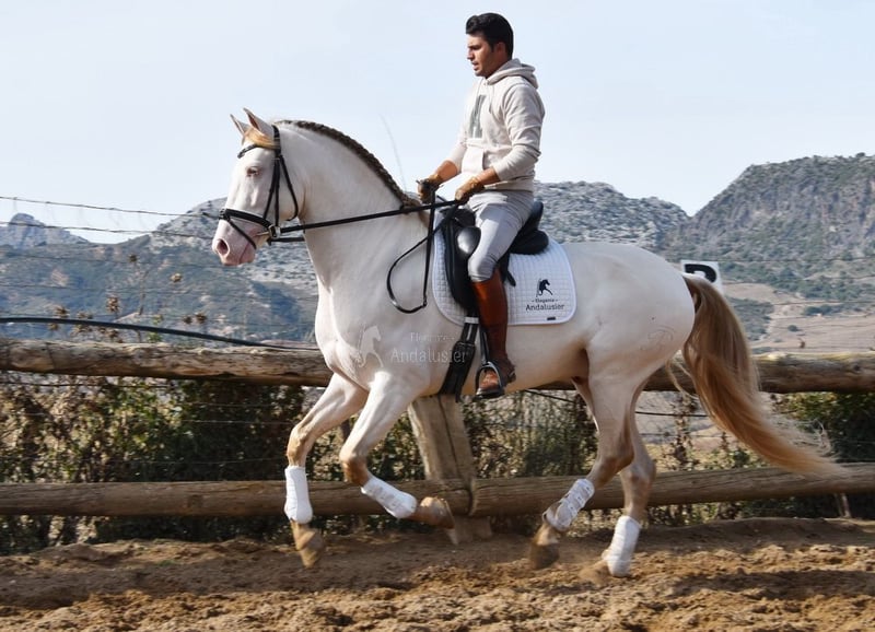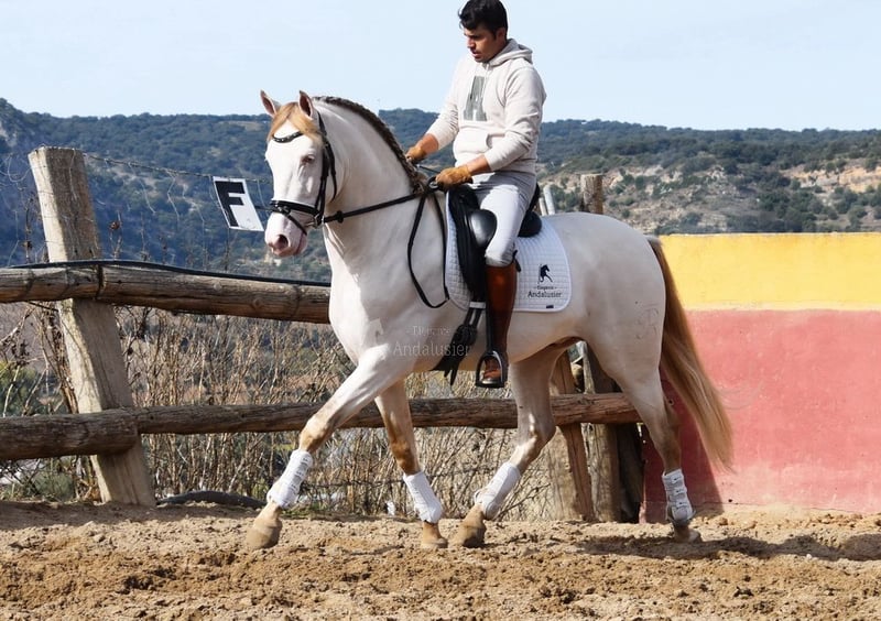 Charactère doux avec un tempérament agréable, curieux et câlin, monté en allures de base, exercices de côtés, reculer, pas espagnol, début de piaffer et de passage, se plie, en terrain, grand, bons mouvements, couleur spéciale, Bayo Perla (CrPrl) avec papiers PRE, inscrit, Piro négatif, adapté aux enfants et aux cavaliers peu expérimentés. Ascendance : Yeguada san Benito Abad, Paco Martí, Yeguada la Llana, Ururopa Gaucho III est qualifié. www.elegante-andalusier.com