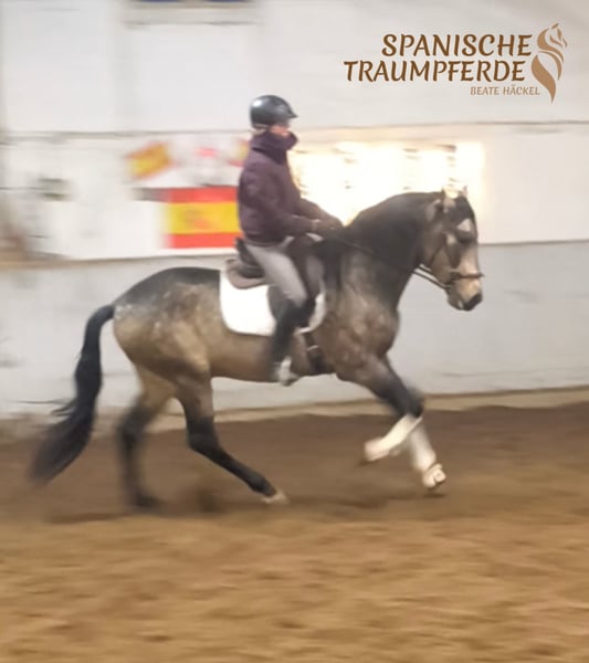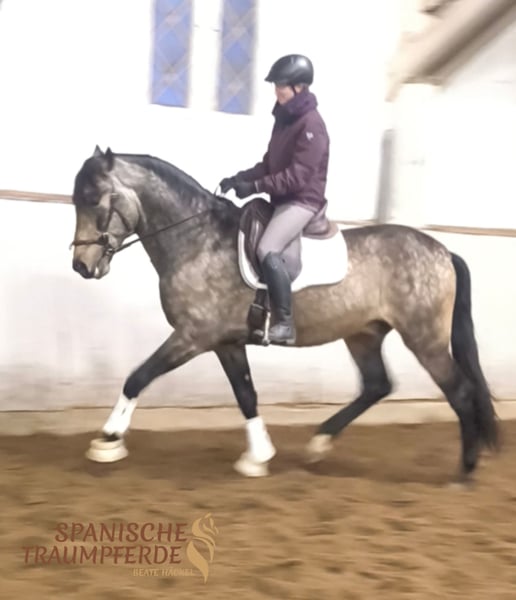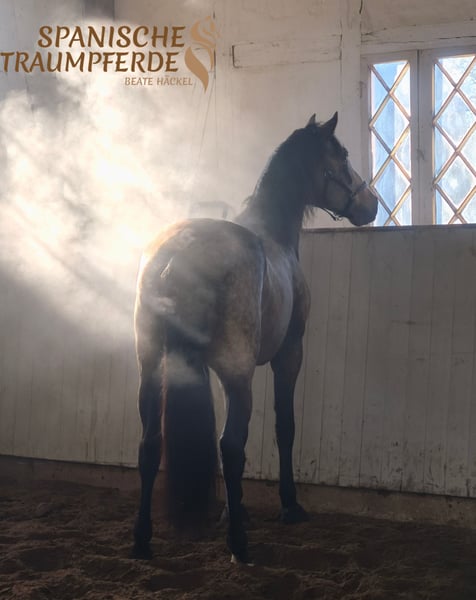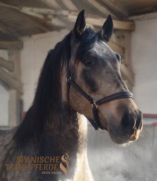Ein ganz besonderes und wunderbares Wesen ist unser fünfjähriger gekörter PRE-Hengst ✨ RENE SH✨. Wer eine Perle zum Weiterausbilden sucht, hat mit diesem zauberhaften PRE-Hengst das richtige Pferd gefunden. Dieser ausnehmend schöne Kerl überzeugt mit einem sehr harmonischen Exterieur mit taktvollen, ausbalancierten Gängen, dazu mit einer extravaganten Fellfarbe. ✨RENE SH✨ ist ein Pferd für Liebhaber des etwas großramigeren PRE-Pferdes mit einem feinfühligen, sensiblen Charakter, aber mit voller Hingabe zu seiner Bezugsperson. Wer das Vertrauen und das Herz von RENE gewinnt, dem schenkt er seine ganze Seele. Er ist ein aufmerksamer Partner und stets bemüht, alles richtig zu machen. Im Umgang begegnet RENE Fremden anfangs mit sanfter Zurückhaltung, doch wer sein Herz berührt, erlebt eine innige Verbindung zu diesem zauberhaften Wesen. Bei der Arbeit beweist dieser Schöne eine unglaubliche Nervenstärke und Gelassenheit. RENE SH ist bei seinem Züchter im Herdenverband gesund groß geworden und wird derzeit altersgerecht gefördert. Unser charmanter Herzensbrecher ✨RENE SH✨ ist derzeit Basis auf Trense geritten. Videos sind auf meiner Homepage zu finden: www.spanische-traumpferde.de Röntgenbilder sind vorhanden. Standort: 23795 Traventhal Ein Kennenlernen unseres RENE ist nach Terminabsprache nahezu jederzeit möglich. Für diesen Termin nehmen wir zum Schutz unserer Pferde eine Pauschale von 50,-€.