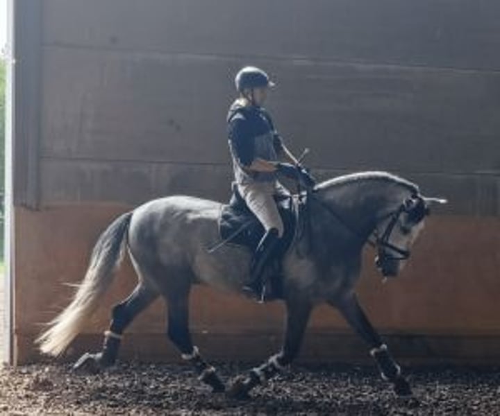 Elegance in the gaiters, seriousness in the head This young 4-year-old horse is exactly where we like to find a promising horse: well-groomed, balanced, ready to learn... and above all, with the foundations already carefully laid. He works at three paces, with suppleness, regularity and real quality of movement. The walk is ample, the trot airy with suspension, and the canter is comfortable and well-paced. Everything about him suggests a bright future in dressage. But beyond the gaits, it's his character that stands out. He's an attentive, willing horse, connected to his rider. He doesn't shy away from requests; he seeks to understand. He's already ready to progress. He has participated in a few social competitions with excellent results. Calm, diligent, without stress or excess. He has this inner confidence that is not found in all young horses. He is now in an ideal phase: delicate work.cat The breaking-in is complete, properly executed, and he is now ready to begin learning dressage exercises. We recommend him to a serious amateur horse rider, who wants to progress in dressage while avoiding the more complex stages of the young horse. He could also be suitable for a horse rider aiming for competition, provided that they prioritize gentleness, progression and quality of the relationship. This young stallion is a real opportunity: potential, balance and excellent temperament. At IberHorse, we have been selecting noble, healthy and well-bred horses for our clients throughout Europe for over 13 years. If this horse has caught your attention, contact us to schedule a call or visit. He's well worth checking out.