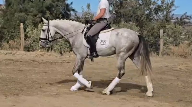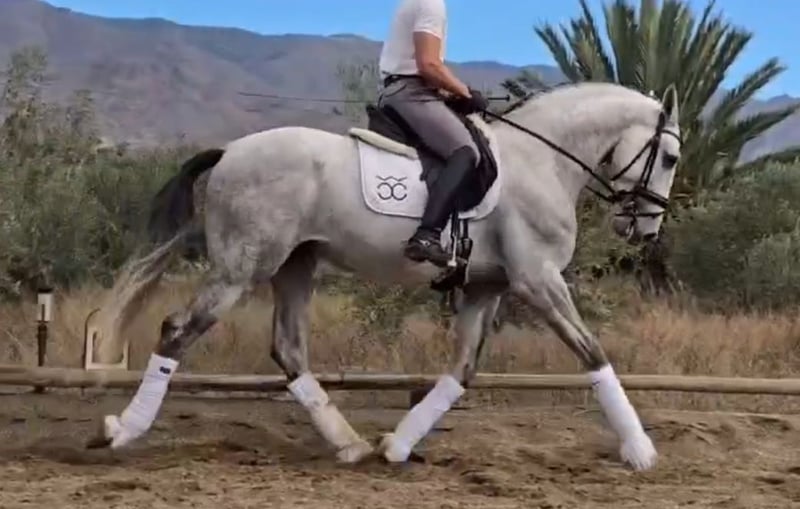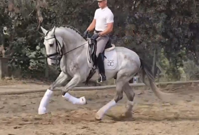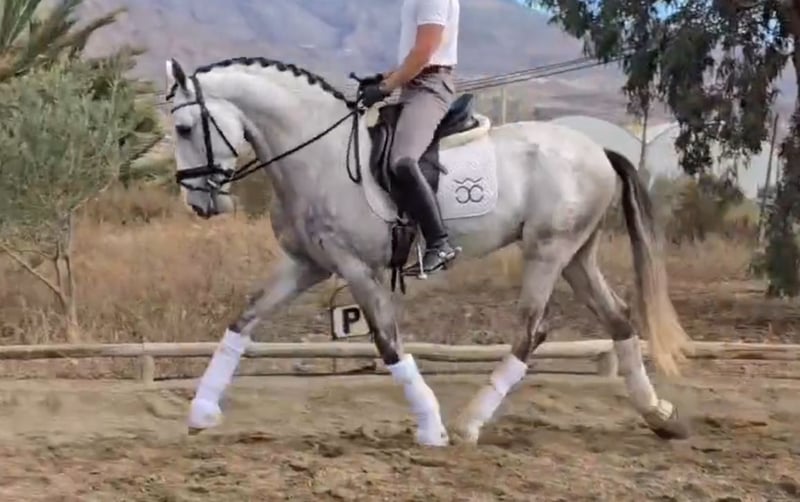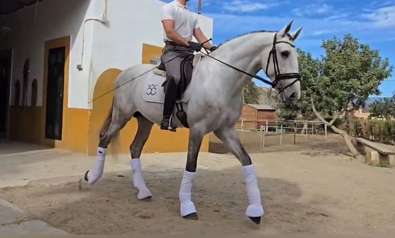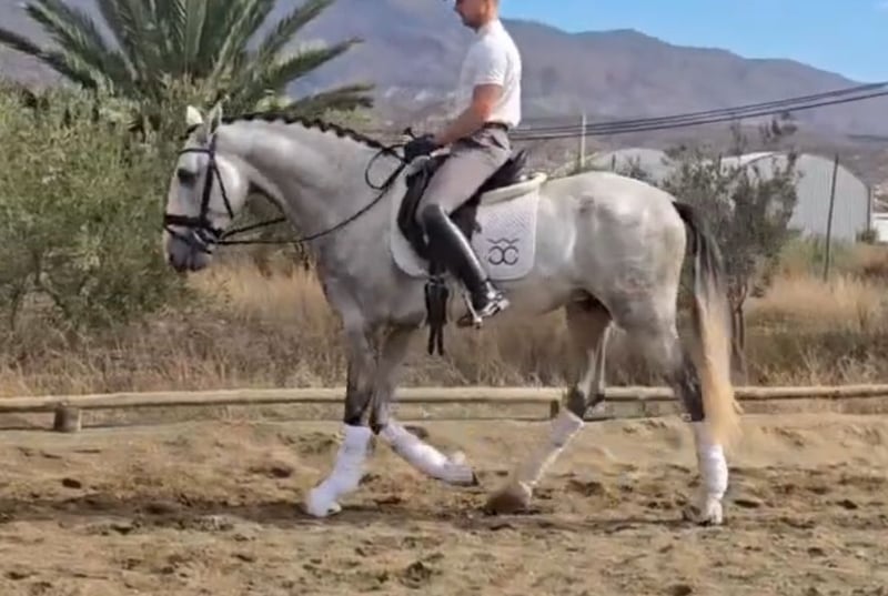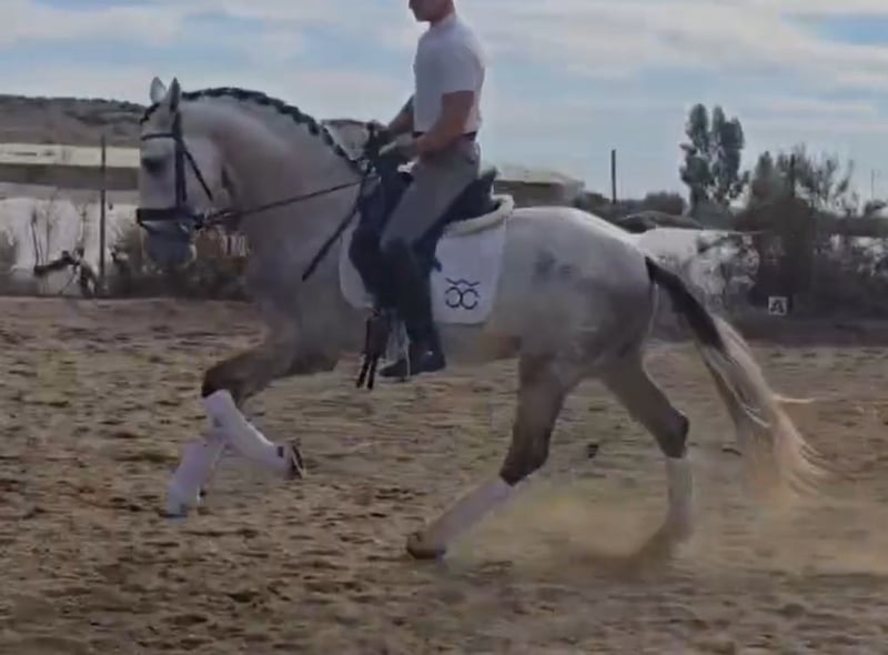 BREED: PURA RAZA ESPAÑOL DOB:2021 Height: 1.68 meters - 16.2 hands Gender: stallion Level: Basic level ridden and developing with professional rider, has excellent behavior handleling and under saddle too even is a young horse he answer really good to the rider aids and is safe, he will not spook for the aid leg, easy to ride. Being lunged for warm up. Vetcheck can be schedule under serious inquiry by interested client side. Category B 12.000€ - 20.000€ +Tax in Europe