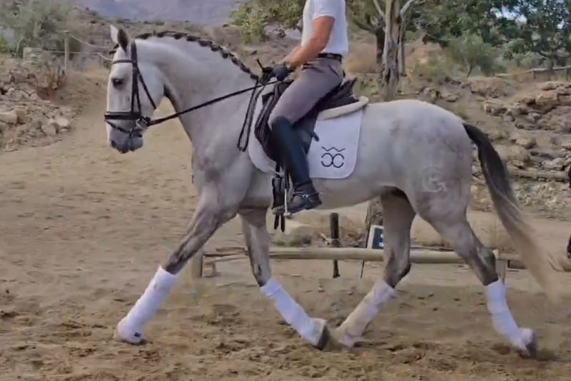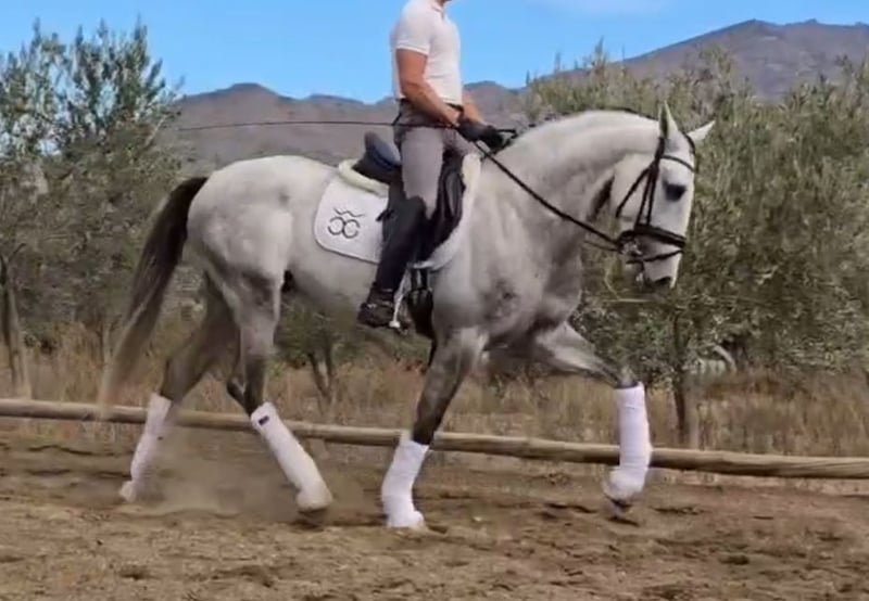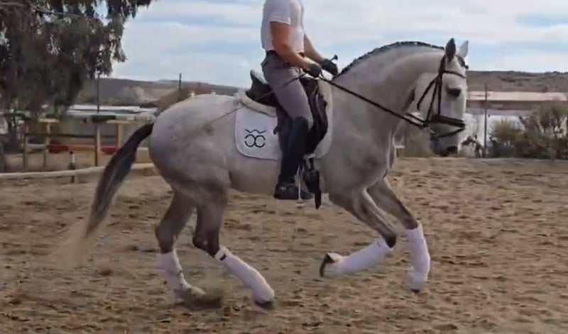 BREED: Pure Spanish Horse (Pura Raza Española) DOB: 2021 Height: 1.68 meters – 16.2 hh Gender: Stallion Level: Basic ridden work, currently being developed with a professional rider. Exhibits excellent behavior, handling, and under saddle. Despite his youth, he responds very well to rider aids and is safe to ride. He does not spook at leg aids and is easy to handle. Currently being lunged for warm-up. Vet check can be arranged upon serious inquiry by interested buyers. Category B €12,000 – €20,000 + VAT within Europe