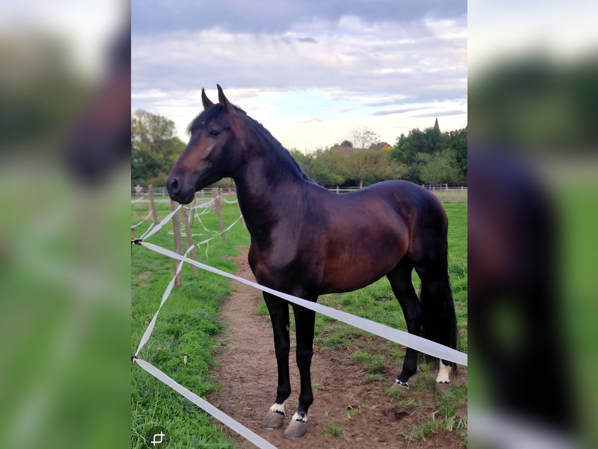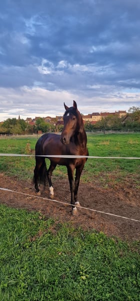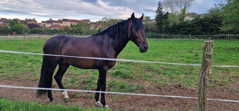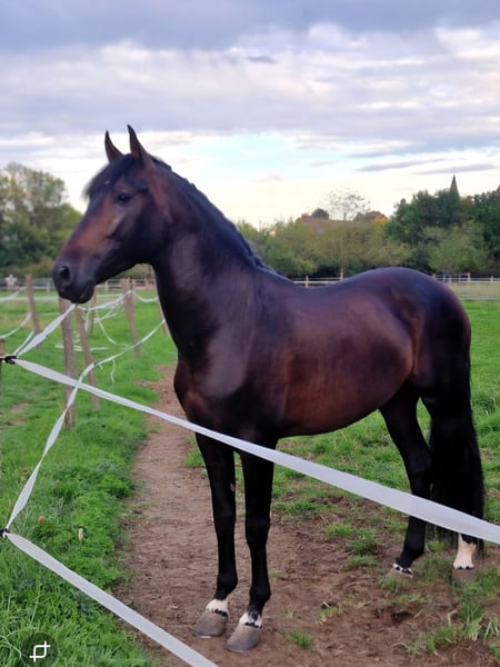 À vendre : Étalon PRE né en 2020, de couleur bai brun, mesurant environ 155 cm au garrot. Importé d'Espagne, ce cheval a été debourré tardivement. Équilibré et calme mais avec du caractère, il apprend vite et a un très bon potentiel en dressage ou pour le spectacle. Idéal pour un projet de dressage ou pour continuer sa formation dans un cadre sérieux. Apte à la reproduction et issu d'une bonne lignée. A une fistule au niveau de la glande parotide (de la taille d'une tête d'épingle) qui n'empêche en rien son travail et n'altère pas sa santé, mais la salive goutte par cet origine lorsqu'il mange.