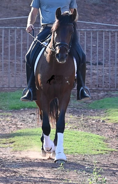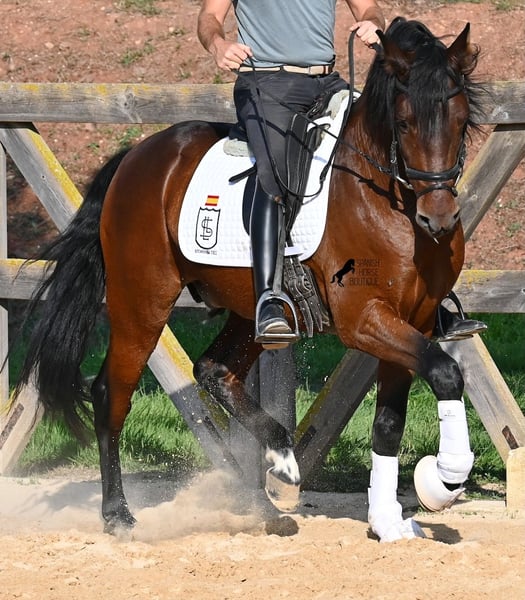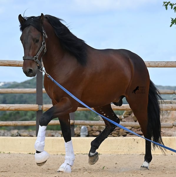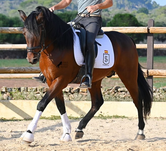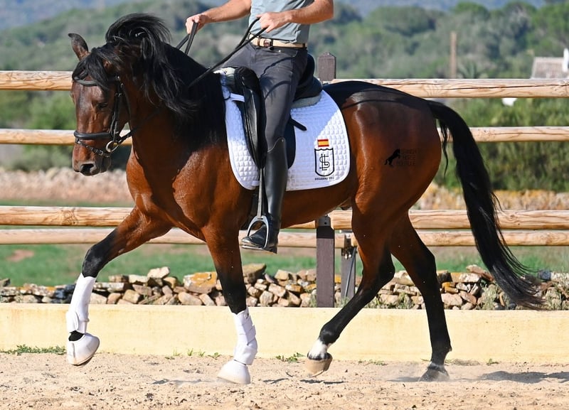 This 2020-born, purebred PRE stallion (Andalusian with pedigree proof from ANCCE) is a real powerhouse bursting with energy at work! He comes from a loving breeder, where late developers like the Spaniards get what they really need - time! He was kept completely raw in the stallion herd until the age of 3, then briefly stabled to learn the basics, and then sent back out to relax and process everything at his own pace. Currently, he has a solid foundation under saddle, with a particular focus on helping him learn to differentiate between his forward drive and relaxation phases under the rider. He is increasingly learning to carry himself, stretch, and extend his relaxation phases, which is very nice to see. A horse that has not been rushed in training but is allowed to find himself and learn to direct his energy. And he has endless willingness to work! Where others quickly run out of steam, he gives more and is tireless, making him an ideal horse for very ambitious riders who enjoy regular and targeted training. He is ridden in a double-jointed water snaffle and is only shod in the front hooves. At night, he lives in a stallion paddock, which is very beneficial for his mind, and during the day, he is in a box for attentive care and proper feeding, which is better guaranteed. Trail rides on the hectare-sized area also do him good, and you can really see how he finds his center there, providing a positive change from the arena. On lighter workdays, he goes into the lunging machine and continues to build muscle without carrying weight. In his pedigree, we find exceptional stallions such as YACO de TORRELUNA, ERMITAÑO III, and his brother is very successful in dressage and has even made it to the SICAB (World Championship of the PRE). He has not yet covered any mares and is accustomed to being near mares, with the option of castration available on-site, of course. Currently, he measures 157 cm and has a beautifully baroque exterior, with a fine Spanish head and good movements, making him interesting for many disciplines with a high level of work. Price category E-F! His location is Menorca. Videos and pedigree available upon request. I would be happy to organize an AKU (veterinary examination), training, castration, transport, or even your trip if you wish to come and see him in person. Details can be found on my page or in conversation. Greetings from Spain!