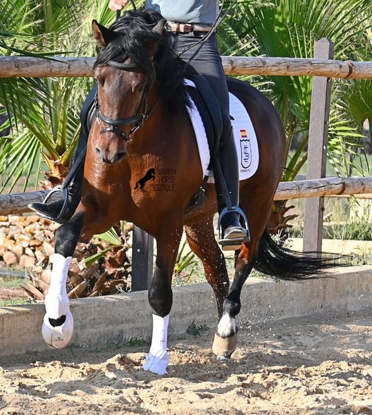 Deze hengst, geboren in 2020, is een pure PRE (Andalusische paard, met rasbewijs van de ANCCE) en een echt krachtpakket dat barst van de energie tijdens het werk! Hij komt van een liefdevolle fokker, waar laatrijpe paarden zoals de Spanjaarden krijgen wat ze echt nodig hebben: tijd! Zo heeft hij tot zijn derde jaar volledig onbeleerd in de hengstenkudde gestaan, is daarna kort opgestald om de basis te leren en vervolgens weer op vakantie gegaan om alles de tijd te geven te verwerken. Momenteel heeft hij een goede basis onder het zadel, waarbij vooral wordt gelet op een goede differentiatie tussen zijn drang naar vooruit en rustmomenten onder het ruiterzadel. Hij leert steeds beter zichzelf te dragen, zich te strekken en rustperiodes te verlengen, wat mooi om te zien is. Een paard dat niet gehaast in de opleiding is, maar eerst zichzelf mag vinden en leert zijn energie te kanaliseren. En hij heeft een enorme arbeidsethos! Waar anderen snel de puf verliezen, geeft hij meer en is onvermoeibaar, waardoor hij zeker een ideaal paard is voor zeer ambitieuze ruiters die graag regelmatig en doelgericht trainen. Hij wordt gereden met een dubbelgebroken watertrens en is alleen aan de voorbenen beslagen. 's Nachts leeft hij op een hengstenpaddock, wat goed is voor zijn hoofd, en overdag staat hij in de box voor zorgvuldige verzorging en juiste voeding. Uitritten op het hectare grote terrein doen hem goed en je merkt echt dat hij zijn balans vindt, als een positieve afwisseling op het rijbaan. Op lichte werkdagen gaat hij in de longeerbak en wordt hij zo verder gemuscleerd, zonder gewicht te dragen. In zijn afstamming vinden we uitzonderlijke hengsten zoals YACO de TORRELUNA, ERMITAÑO III, en zijn broer is zeer succesvol in de dressuur en heeft zelfs deelgenomen aan de SICAB (wereldkampioenschap voor PRE). Hij is nog niet gedekt en is gewend in de buurt van merries te zijn, waarbij de optie van castratie ter plaatse uiteraard aanwezig is. Hij meet momenteel 157 cm en heeft een mooi barokke uitstraling, met een fijn Spaans hoofd en goede bewegingen, waardoor hij voor veel disciplines met een hoog werkniveau interessant is. Prijsindicatie E-F! Zijn locatie is Menorca. Video's en afstamming op aanvraag. Graag organiseer ik ter plaatse een keuring, beredenheid, castratie, transport of ook uw reis, mocht u persoonlijk komen kijken. Details hierover zijn te vinden op mijn website of in een gesprek. Saludos uit Spanje