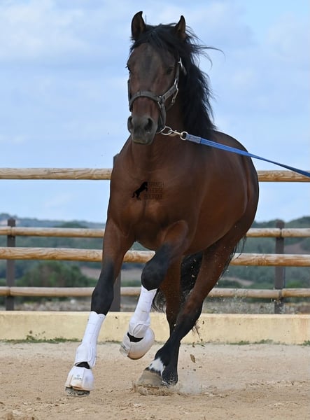 Ce cheval PRE pur-sang, né en 2020 (avec pedigree espagnol certifié par l'ANCCE), est un véritable concentré d’énergie, débordant d’enthousiasme pour le travail ! Il provient d’un éleveur attentionné, où les chevaux tardifs, comme les Espagnols, reçoivent le temps dont ils ont besoin pour s’épanouir. Jusqu’à l’âge de 3 ans, il est resté entier dans un troupeau, puis a été brièvement débourré pour apprendre les bases, avant d’être à nouveau mis au repos pour assimiler tout cela avec patience. Il possède actuellement de solides bases en selle, où l’on veille particulièrement à lui apprendre à différencier son envie d’avancer de ses phases de calme sous la selle. Il progresse constamment dans l’équilibre, s’étire, et parvient à prolonger ses phases de repos, ce qui est très encourageant à voir. C’est un cheval qui n’a pas été pressé dans sa formation, mais qui a pu prendre le temps de se trouver, d’apprendre à canaliser son énergie. Son envie de travailler est sans limite ! Là où d’autres perdent rapidement leur souffle, il en redemande et ne se fatigue pas, ce qui en fait sans doute un cheval idéal pour des cavaliers très ambitieux, qui aiment s’entraîner régulièrement et de manière ciblée. Il se monte avec une morsure à double brisure et est seulement ferré aux antérieurs. La nuit, il vit en paddock avec des hongres, ce qui lui fait beaucoup de bien mentalement, et la journée, il est en box pour un soin attentif et une alimentation adaptée, garantissant son bien-être. Les sorties en liberté sur un terrain de plusieurs hectares lui permettent de retrouver son équilibre, en apportant une agréable diversité par rapport à la carrière. Lors des journées plus légères, il travaille en longe ou en machine, pour continuer à le muscler sans porter de poids. Son pedigree inclut des étalons exceptionnels tels que YACO de TORRELUNA, ERMITAÑO III, et son frère, qui a rencontré beaucoup de succès en dressage et a même participé au SICAB (championnat du monde PRE). Il n’a pas encore été utilisé pour la reproduction et connaît la proximité des juments, avec la possibilité de le faire castrer sur place si souhaité. Il mesure actuellement 157 cm et possède un joli profil baroque, avec une tête fine de type espagnol et de belles allures, ce qui le rend intéressant pour de nombreuses disciplines exigeantes. Prix : catégorie E-F ! Il se trouve à Minorque. Vidéo et pedigree disponibles sur demande. Je peux également organiser une visite avec une inspection vétérinaire, un débourrage, une castration, un transport ou votre voyage pour venir le voir en personne. Plus de détails sur mon site ou lors d’un échange. Saludos desde España