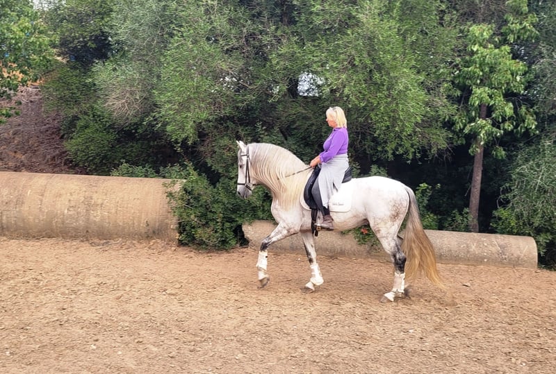 A stunning, beautiful PRE stallion with a classic baroque appearance of the old type. The young stallion is correctly conformed and harmoniously built. He has an exceptionally calm temperament, is very well-behaved when groomed, and stands quietly next to another stallion. My lively dogs have never bothered him. This grey is equipped with three good basic gaits that are very comfortable to sit. His canter is beautifully uphill and expressive. He has been ridden in the basic gaits, and work is ongoing on leg-yields and shoulder-in. He has also been ridden in the field and proves to be very well-behaved there as well. Pedigree: Sire is Hacendado (Marin García), Pampero VII. The horse is being sold on behalf of the owner. He can remain in training with us if desired. A veterinary examination (AKU) will be organized shortly. International transport can be arranged.