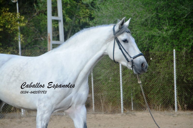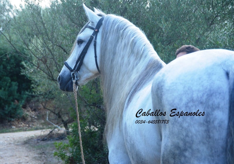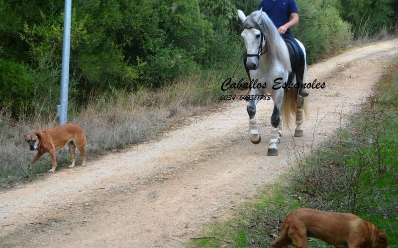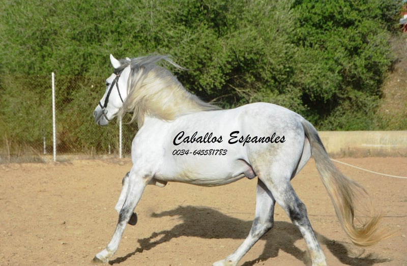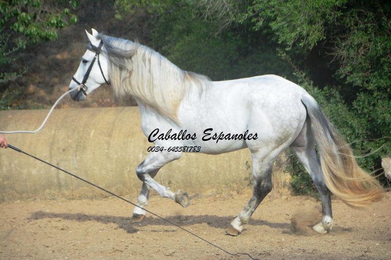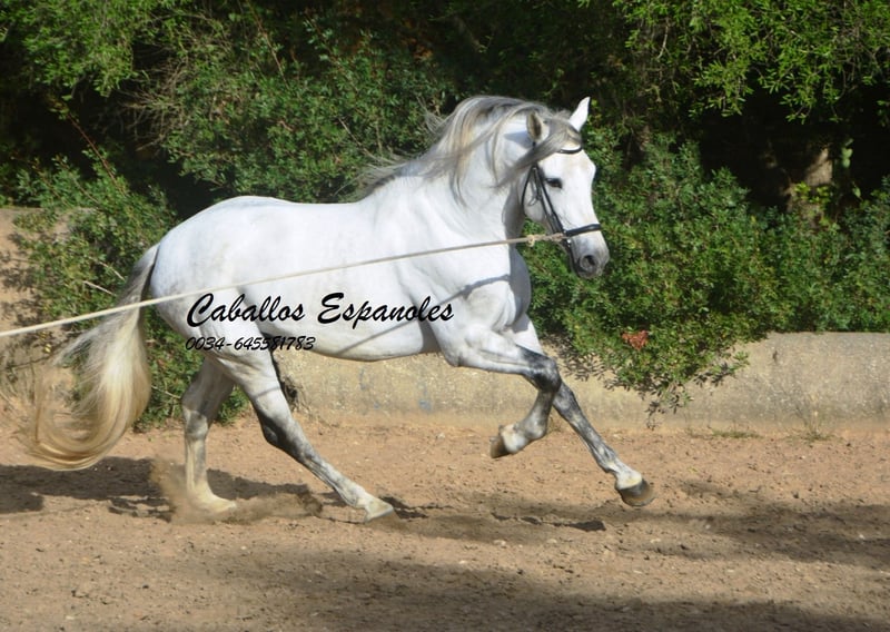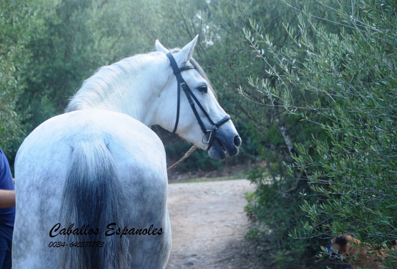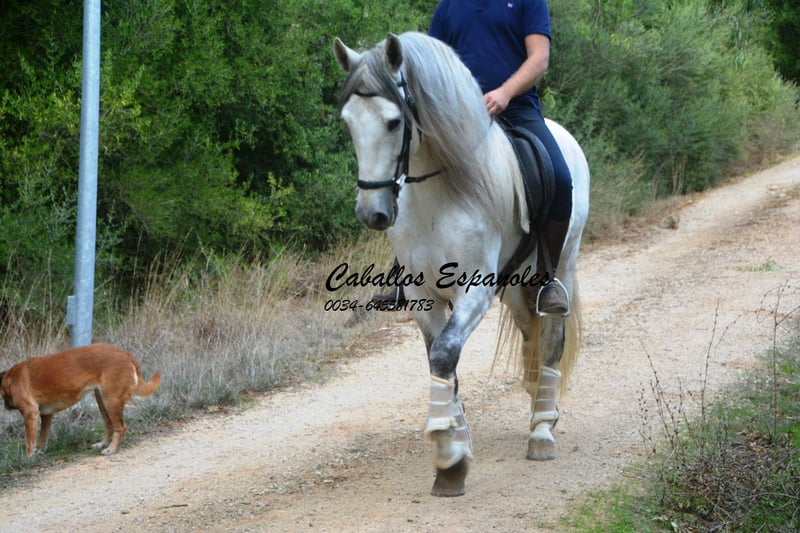 Een droomachtige, prachtige PRE-hengst, in barokke uitstraling van de oude soort. De jonge hengst is correct en harmonieus gebouwd. Hij heeft een zeer evenwichtig karakter, is superbraaf tijdens het verzorgen en staat rustig naast een andere hengst. Mijn speelse honden hebben hem nooit lastiggevallen. De grijze is uitgerust met drie goede basisgangen die zeer comfortabel zitten. Zijn galop is mooi bergop. Hij is in de basisgangen gereden, er wordt gewerkt aan schouder- en flankrijden en zachte beenhulpen. In het terrein was hij ook en toont zich daar zeer braaf. Afstamming: vader is Hacendado (Marin García), Pampero VII. Het paard wordt in opdracht verkocht. Hij kan graag bij ons nog in opleiding blijven. Een keuring wordt op korte termijn georganiseerd. Internationaal transport mogelijk.
