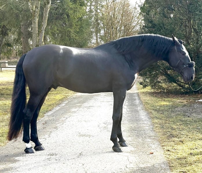 Enamorado de Agu is our impressive jet-black Pure Spanish Horse stallion with a noble stature (16.1 hh) and a captivating presence. Born on February 14, 2020, as a Valentine's Day gift, he chose his romantic name "Enamorado," which translates to "I love you." His noble character perfectly reflects the ideal temperament of a Spanish stallion: friendly, honest, calm yet alert. This dream stallion is now ready to showcase his high potential and shine alongside his new owner. His rider will be spoiled by his impressive, smooth gaits and excellent work ethic. He is a thoughtful stallion that is always "present" under saddle. The more refined the riding, the more he rewards with an incomparable feeling. Enamorado is focused during work; he enjoys and seeks regular training. We are looking for an experienced and ambitious rider who can further develop his dressage skills. His slightly dominant stallion traits are well manageable and only surface when he is under-stimulated, never under saddle. Enamorado is progressing steadily. His current training includes basic dressage in walk, trot, and canter. He is familiar with long rein work and obstacle training, such as a small ramp. Thanks to his excellent temperament, he can be relied on in new situations both on the ground and under saddle. A horse like this is a masterpiece of a true artist – one that you will not find a second time! He is preferably sold to a place where he can remain a stallion. In his outdoor box, he is housed alongside geldings. He enjoys daily turnout on paddock or pasture, as well as lunging and aquatrainer sessions. He has been in Germany for five years, where he was raised and trained under excellent conditions. Of course, Enamorado has full ANCCE registration (with a magnificent pedigree) and is already basis-licensed with a licensing index over 100. He would undoubtedly be a valuable addition to PRE breeding! He has been regularly dewormed, vaccinated, osteopathically treated, and presented to the farrier. He is approved for export to America and has all the necessary tests completed. X-rays and all veterinary reports are available. Due to a minor cosmetic flaw, he is currently being sold well below value. For further information, please contact me exclusively by phone at +49 151 15227320.