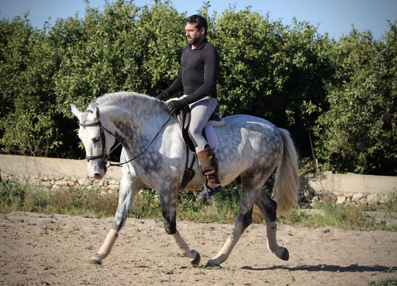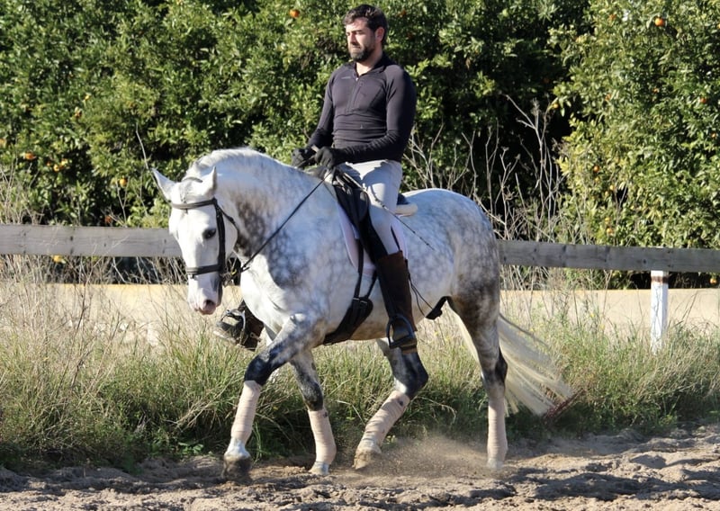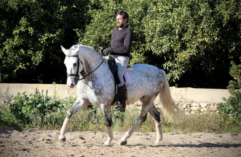 Ein PRE wie aus dem Bilderbuch: der junge Hengst KALAMBRUJO stammt aus der berühmten Zucht Plaza de Armas und überzeugt durch ein besonders barockes Erscheinungsbild. Mit seiner auffälligen Zeichnung und seinem edlen Kopf ist er ein besonders würdiger Vertreter seiner Rasse. KALAMBRUJO ist altersgemäß gut in den GGA geritten, Seitengänge sind angefangen. Er geht zudem sehr gut ins Gelände, alleine wie auch in der Gruppe. KALAMBRUJO ist äußerst sitzbequem und unter dem Reiter sehr brav und zuverlässig. Er besitzt volle Papiere des spanischen Züchtervereins ANCCE und ist frei von Schimmelmelanomen. Standort Spanien.