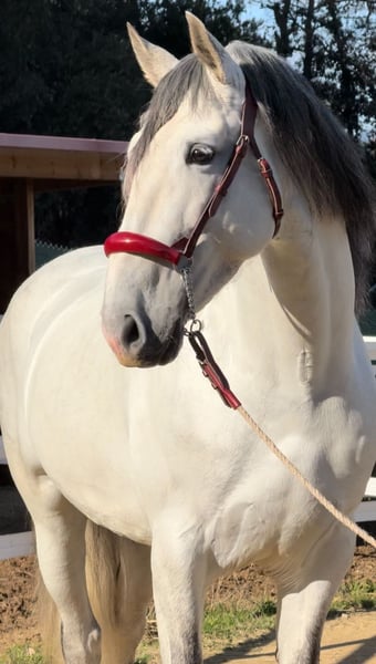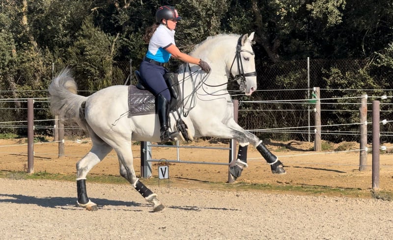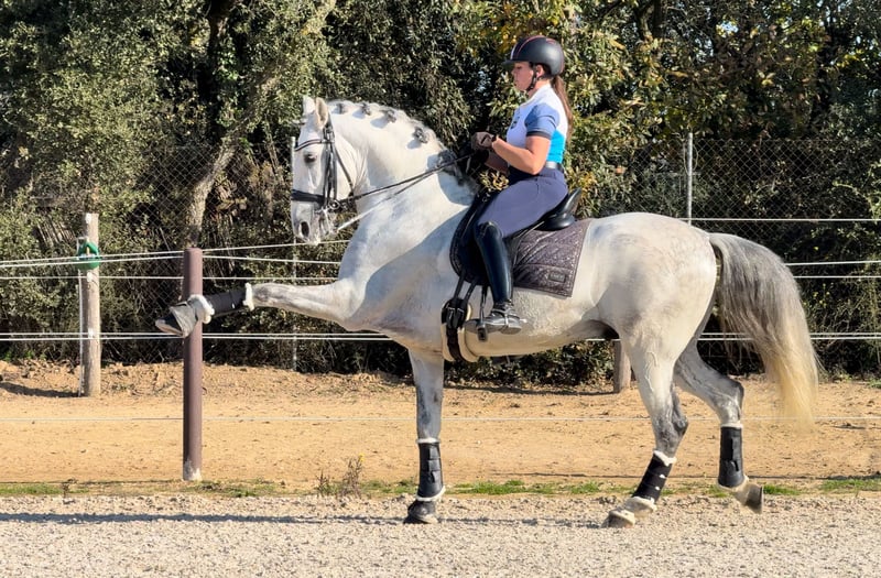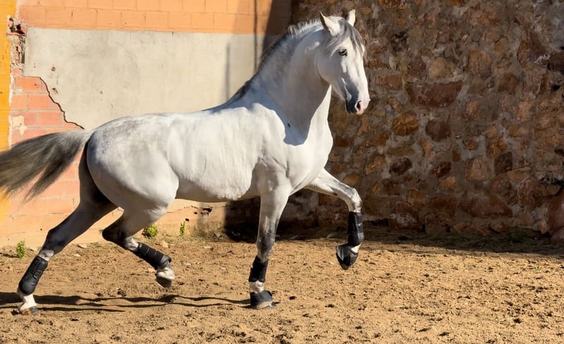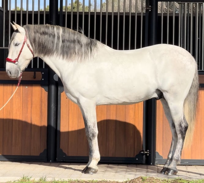 Registered PRE with ANCCE – full papers available + PYRO FREE This striking grey PRE stallion, born in 2019 and standing 164 cm, combines classic Andalusian elegance with genuine athletic ability. He presents a refined, correct conformation, expressive yet balanced movement, and a calm, cooperative temperament that makes him a pleasure to work with. Bred in the traditional PRE type but developed for modern dressage, he shows natural collection and already understands piaffe and passage, highlighting his strength, balance, and willingness to perform. His rideability and sensible attitude make him suitable not only for professional training but also for confident amateurs looking for a quality partner. Whether your goal is competitive dressage or a distinguished horse to develop further, this stallion offers a rare combination of talent, character, and presence. A refined and promising PRE with both the mind and ability to progress.