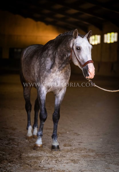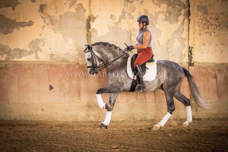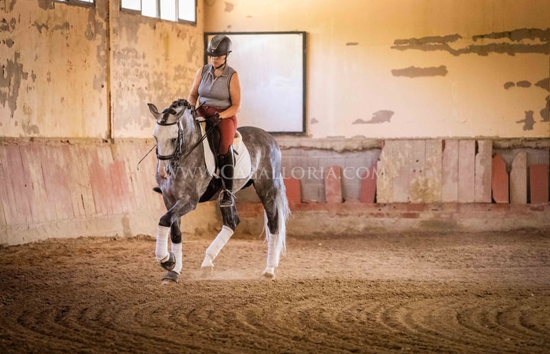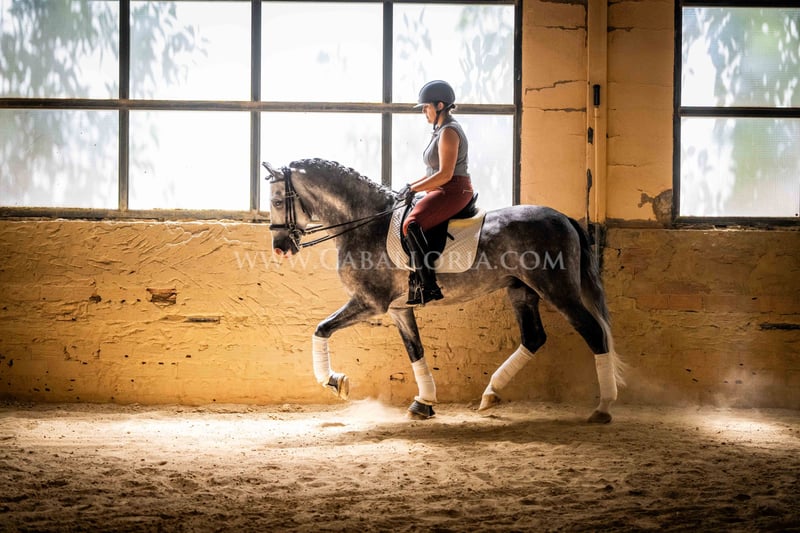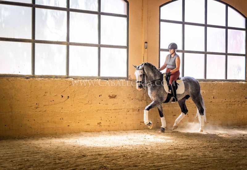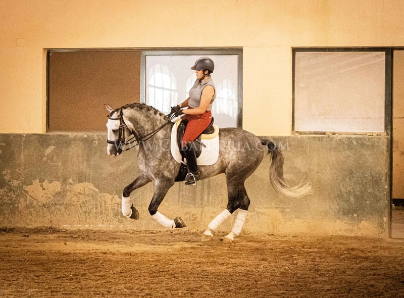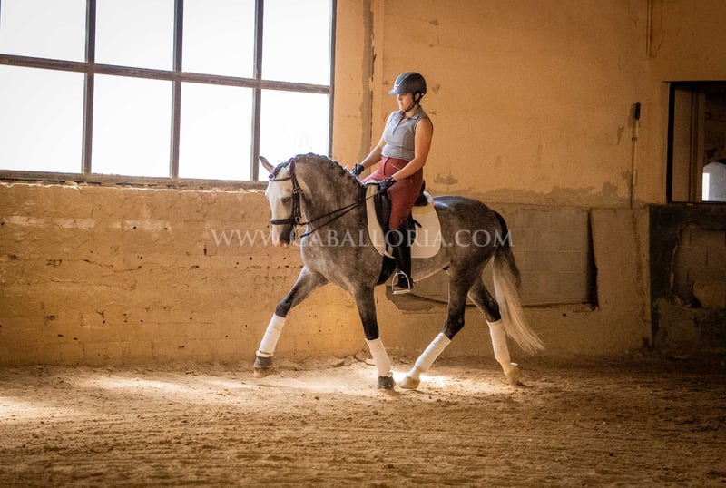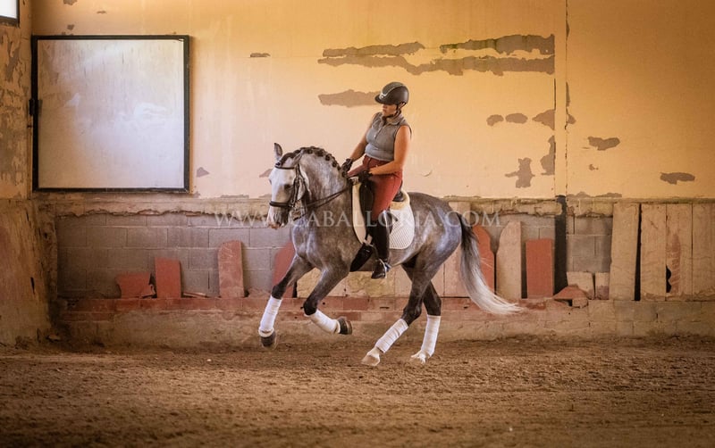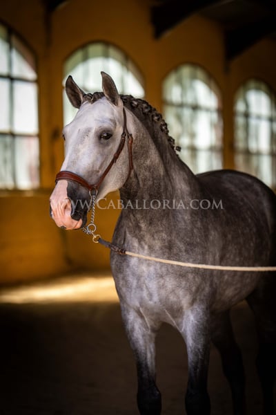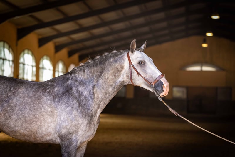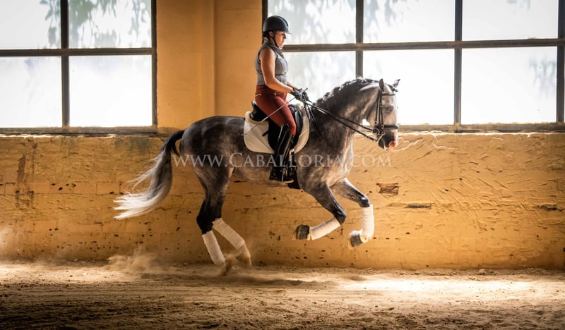 Name: Lukake Momo Born on: 11.06.2019 Height: 1,65 m Training level: L - M (Spanish: Nivel 3 - 4) ANCCE classification: Reproductor básico ( licensed ) Lukake is a licensed and powerful stallion of the Pura Raza Española (PRE). His fine head with the striking blaze gives him a noble charisma. He is ridden in all three basic gaits, has already mastered the piaffe and impresses not only with his ability but also with his strong, self-confident character, characterized by his Yeguada Militar bloodlines. Lukake is a reliable partner, especially in dressage, and shows great potential at a high level. More information on request! *All visual content, including photos and videos, presented by Caballoria S.L. are protected by copyright. This means that the reproduction, distribution, exhibition or any use of these materials without the express and written consent of Caballoria S.L. is strictly prohibited. Copyright law ensures that authors retain control over their works and are appropriately recognized and compensated for their use.