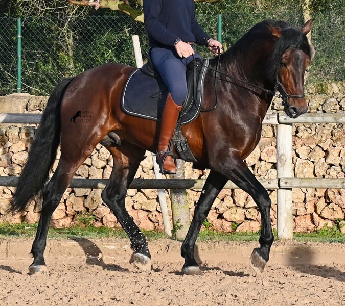 Este caballo PRE nacido en 2019 (Andaluz con certificado de raza de la ANCCE) es un ejemplar de belleza excepcional en muchos aspectos. Su belleza exterior es evidente, pero su carácter amable, su voluntad de trabajo y su disposición a complacerlo también lo convierten en un alma hermosa por dentro. Es increíblemente bien educado, tanto en el manejo como bajo la silla. Siempre atento para hacer todo correctamente y con una perseverancia incansable para agradar. Su entrenamiento es muy sólido; domina trabajos laterales en todas las disciplinas de doma clásica y es muy flexible y suave, lo que también lo hace interesante para la Working Equitation. Entre trabajo y descanso, distingue rápidamente y pasa con gracia de la recogida a la extensión y elongación. Es un caballo muy inteligente, con potencial para más, ya que actualmente solo es montado dos veces por semana por su entrenador, y aún así muestra resistencia, calma, concentración y buena forma física. Ha participado en alguna competición, por lo que también está familiarizado con estar en lugares nuevos junto a otros caballos. No presenta comportamiento de semental y, en la pista, se mantiene tranquilo y concentrado con otros caballos. Aunque se han hecho menos paseos, también los ha realizado en grupo y en solitario. Su linaje es también interesante para conocedores de PRE, ya que por parte de padre proviene íntegramente de Yeguada Militar (Cartujano) y por parte de madre, principalmente de Escalera. Actualmente mide 1,66 m y puede que aún crezca un poco más. Está aprobado y no ha sido utilizado para reproducción. Para quienes no puedan tener un semental, existe la opción de castrarlo en el lugar. Su ubicación actual es Menorca. Videos y pedigrí disponibles bajo petición. Con gusto puedo organizar una revisión veterinaria, entrenamiento, castración, transporte o incluso su viaje si desea venir a verlo en persona. Para más detalles, puede consultar mi página o contactarme directamente. Saludos desde España