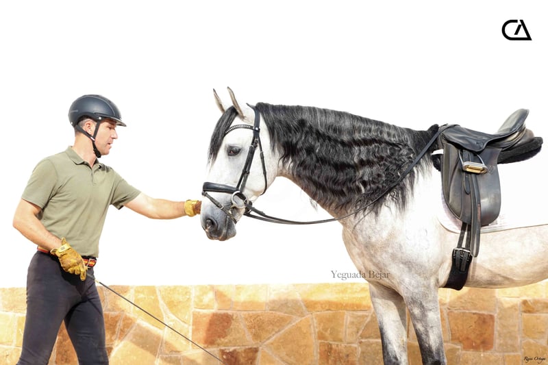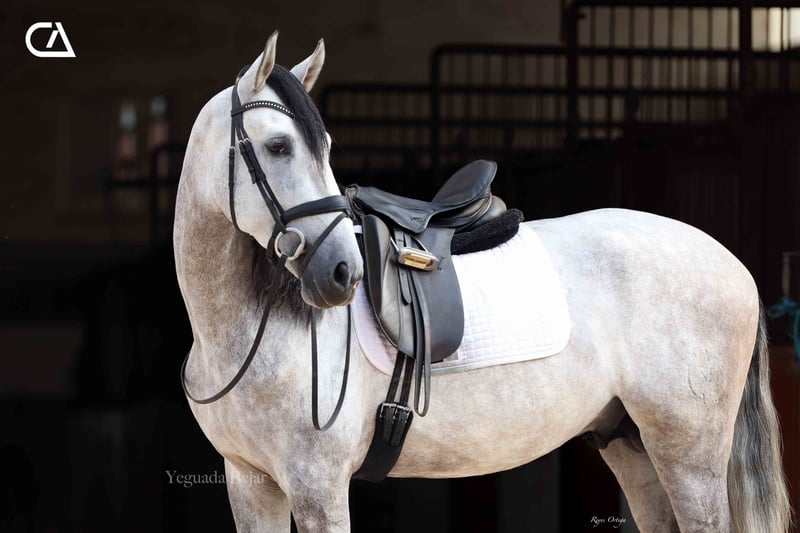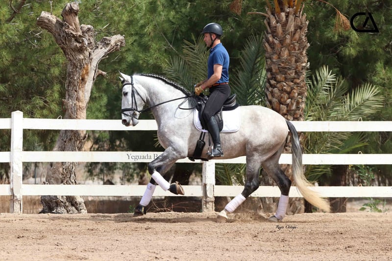 Quisco de Martet is a young gray horse born in 2019 and is 1.71 m high. He is a very beautiful stallion, with very good conformation and three high-quality gaits. His excellent character, extremely docile, makes him handle easy, besides he is sweet and confident with people. At the present, he has a basic level of dressage, and has very good aptitudes and predisposition for learning. His bloodline on his sire sides comes from Armas Felino, from Lagar, both from Yeguada Plaza de Armas, and from Navarro VI from Marín García. His mother is Felina XXXIX, raised by Yeguada Martet, and Lucero VIII's daugther by López-Monis farm. Quisco could be a nice project for the future, both for competition and enjoy with the family.