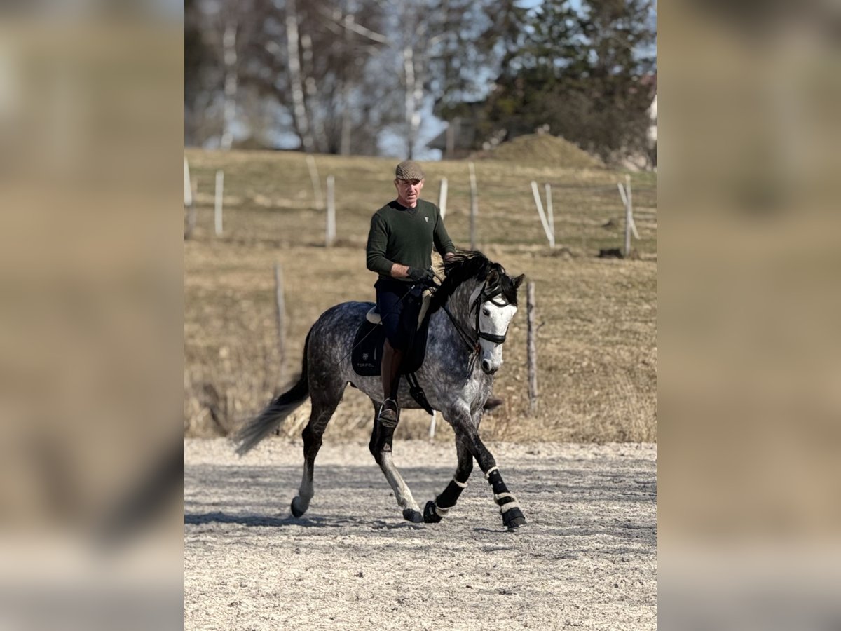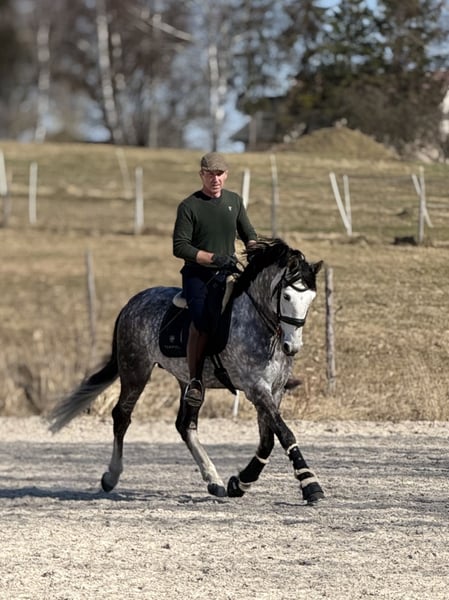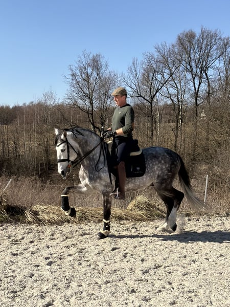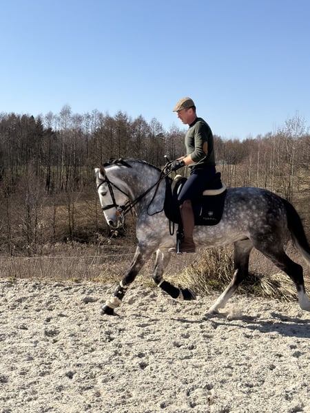 I offer for sale a beautiful Andalusian stallion with very good movement in all three gaits. Bombproof. Wonderful character. Very good head. Learns quickly. The horse performs flying changes, leg yields, and shoulder-in. Healthy. Easy to handle (shoeing, grooming). An ideal prospect for a dressage horse or working equitation. I highly recommend it.