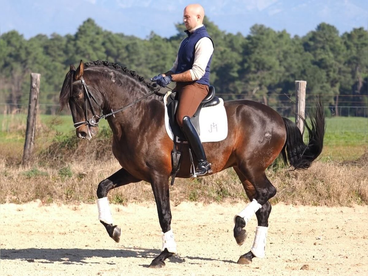 Discover our magnificent Purebred Spanish Horse (PRE), a bay stallion standing 1.67 m tall, with exceptional elegance and beauty. His expansive and rhythmic movement in walk and trot, along with his great potential and strength, make him an ideal choice for dressage. Currently at a medium level, this horse already masters canter half-passes, initiates pirouettes, performs flying changes, and piaffe, demonstrating a solid foundation to continue progressing toward higher levels. Perfect for riders looking for a talented and willing partner to reach the top in competition.