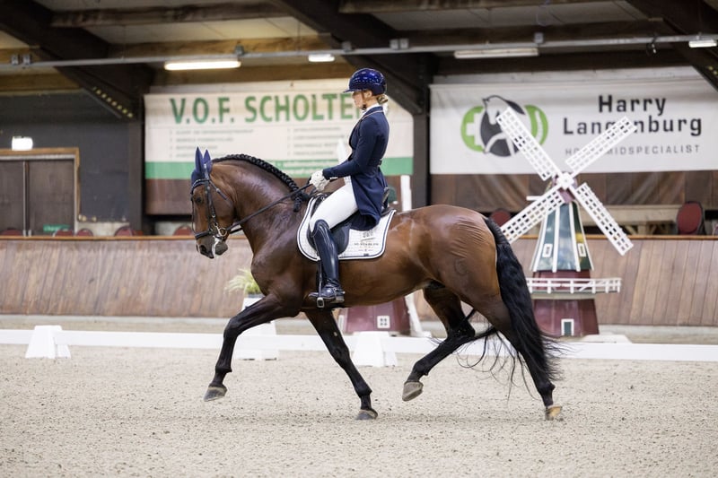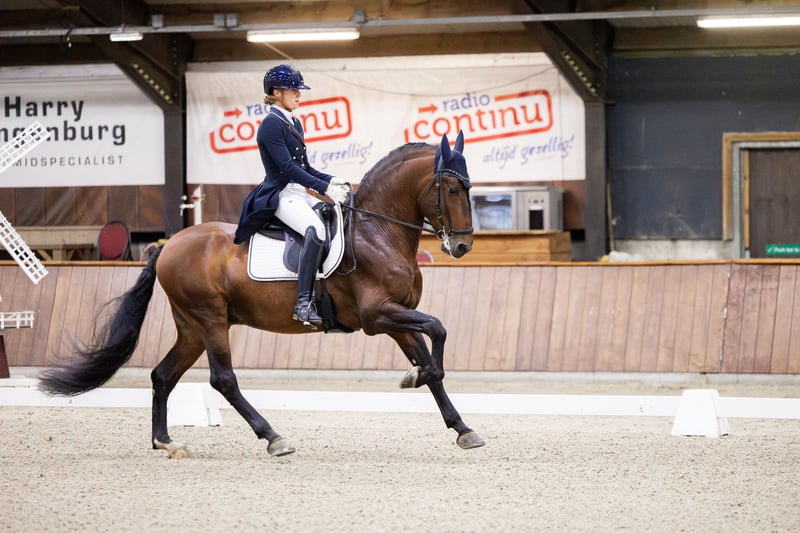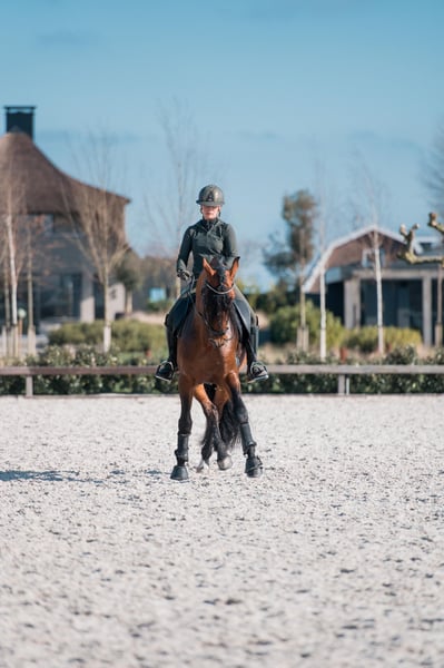 Frisante Torreluna È un bellissimo stallone baio con un bel carattere, ha solo 6 anni ma ha il fattore WOW. Frisante è un cavallo che ruba immediatamente il cuore con la sua bellissima criniera lunga, la sua enorme grinta anteriore e il suo splendido bagliore bronzeo. Ha 3 andature spaziose molto buone, Frisante possiede una camminata molto spaziosa e un grande trotto con una buona gamba posteriore e un canter in salita. È un cavallo con molto potenziale per il futuro, si lascia chiudere facilmente e impara rapidamente. Classificato KNHS L1 e Frisante è addestrato a livello M. Frisante si è qualificato per il CE MCI Boy horses nell'ottobre 2024. Selezione NK MCI 2024 con un bel punteggio di 77% e 75% e 3° posto. Frisante si è classificato al sesto posto in Europa ai Campionati Europei MCI ed è stato il miglior cavallo giovane dei Paesi Bassi. Frisante proviene direttamente dall'allevatore Yeguada Torreluna, completamente approvato, compresi collo e schiena.
