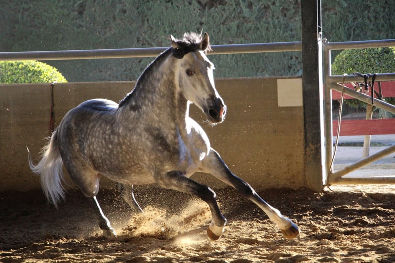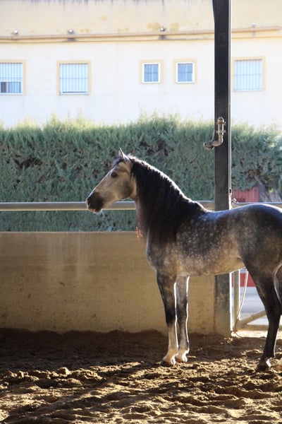 Dieser 2018 geborene spanische Hengst ist das Traumpferd für jemanden, der ein PRE-Pferd mit einem schönen Körperbau sucht. Mit drei guten Grundgangarten ist dieser schöne Schimmel ein komfortables und angenehm zu reitendes Pferd. Derzeit geritten macht er Seitengänge, Piaffe, Passage, Spanischer Schritt und leitet fliegende Wechsel und Pirouetten ein. Er ist ein perfekter Freizeitbegleiter, ein Pferd, das Spaß am Üben im Viereck hat und auch im Stall und mit anderen Pferden sehr brav. Er ist ein ganz besonderes Pferd, mit dem man überall auffällt, wo man mit ihm ist.