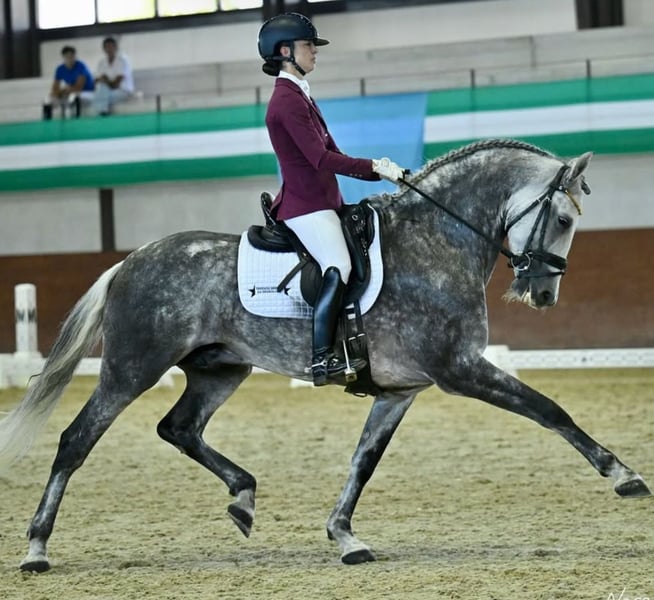 Relamido VI est un cheval très polyvalent, adapté à presque tout type de cavalier souhaitant profiter de la discipline du dressage. Son père, Osado 04, a été l’un de nos meilleurs chevaux dans cette discipline, remportant de nombreuses victoires au niveau Grand Prix, tant au niveau national qu’international. Relamido se distingue par son excellent caractère, qui, associé à une très belle qualité de locomotion, en fait un cheval particulièrement agréable à travailler au quotidien. Il a participé à de nombreuses compétitions dans les épreuves des chevaux de 7 ans ainsi qu’au niveau Saint-Georges, et se prépare actuellement à évoluer vers le niveau Intermédiaire I, en attendant un nouveau cavalier pour poursuivre sa progression. C’est également un cheval très fiable pour les cavaliers recherchant un cheval d’école (schoolmaster), idéal pour apprendre et progresser en dressage. Il est habitué aux sorties en extérieur et montre un comportement très calme et posé. Il convient de noter qu’il peut se montrer légèrement regardant lorsqu’il partage la piste avec des chevaux arrivant en face. Cela n’entraîne toutefois aucun comportement indésirable, mais les acheteurs potentiels doivent garder à l’esprit qu’il s’agit d’un point pouvant être amélioré par le travail.