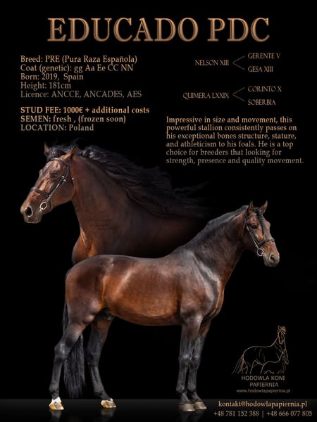 Impresive in size and movement, this powerful stallion consistently passes on his exceptional bones structure, stature, and athleticism to his foals. He is a top choice for breeders that looking for strength, presence and quality movement. More info by Whatsapp ! +48 781152388