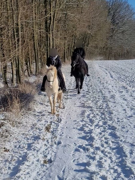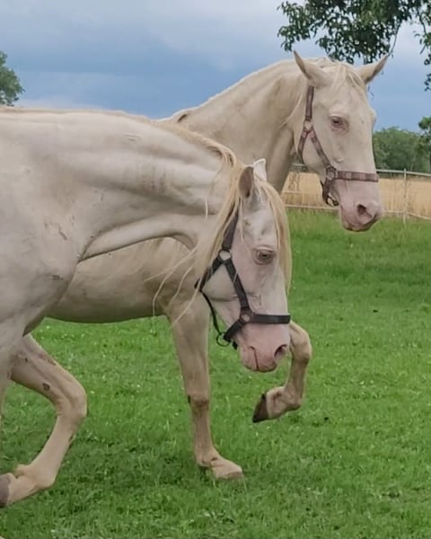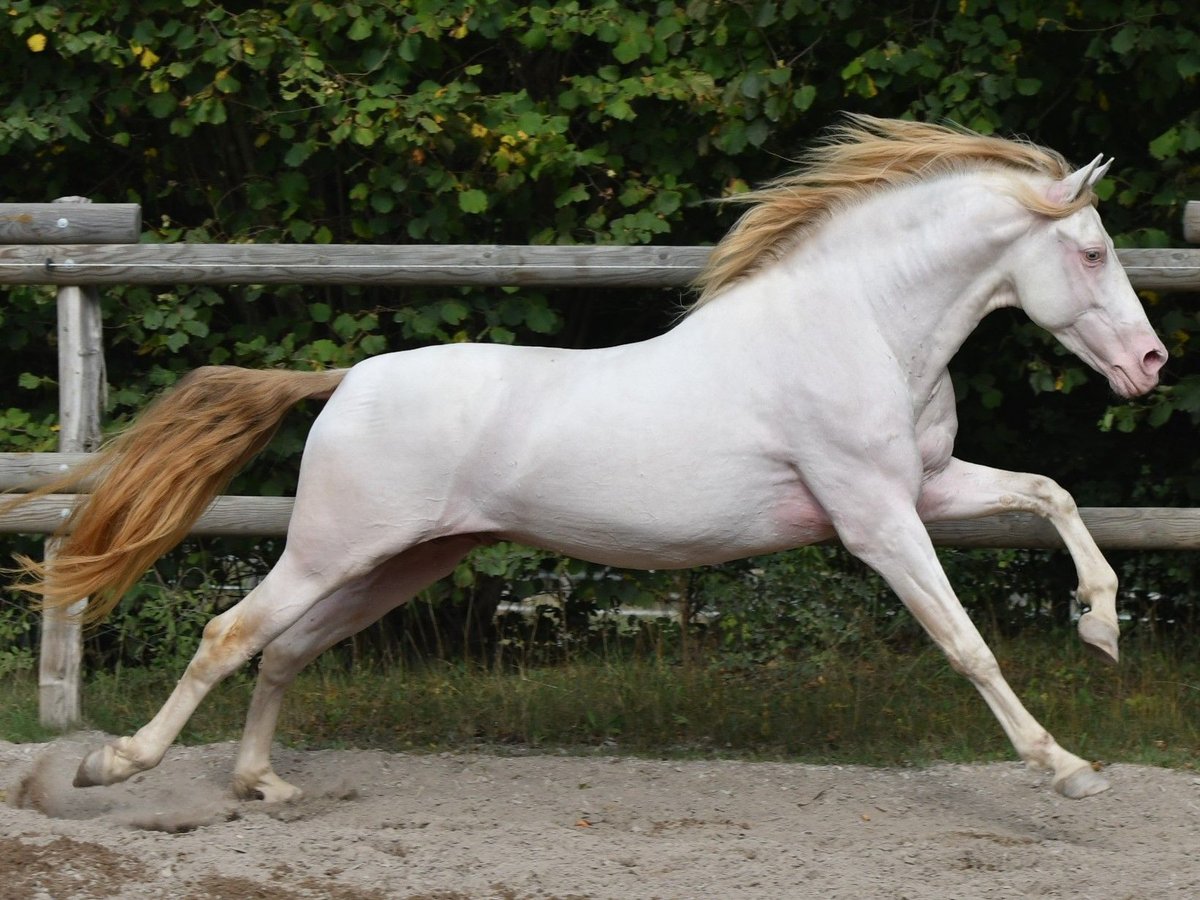 Für die Zuchtsaison 2026 stellen wir unseren PRE Hengst Leo einigen ausgewählten Stuten (alle Rassen) im Natursprung zur Verfügung. Leo ist ein Perlino (ggEEAACrCrnd1nd2), d.h. er vererbt unabhängig von der Basisfarbe der Stute ausschließlich Buckskin bzw. Perlino Fohlen, (je nachdem ob die Stute auch Creme Gen trägt oder nicht). Als Träger von nd1 (Pseudo Dun) kann er zu 50 % auch einen Pseudo-Aalstrich weitergeben. Leo ist gekört beim ANCCE. Fohlen aus PRE Stuten erhalten volle ANCCE Papiere. Er ist negativ getestet auf die üblichen Erbkrankheiten: PSSM1, GBED, HERDA, HYPP, MYHM, MH. Leo überzeugt vor allem durch seinen enorm liebenswerten Charakter. Er ist absolut klar im Kopf und auch in Gegenwart von Stuten, anderen Hengsten oder Wallachen stets gut händelbar. Zudem ist er fein zu reiten, lernwillig, kooperativ und noch dazu extrem sitzbequem. Leo deckt ausschließlich im Natursprung an der Hand. Er deckt trotz Stm 1,52 m Stuten bis mindestens 1,65 m locker ab (unsere Stute ist 165 cm, siehe Collagebild, ist tragend geworden). Aufgrund seiner Größe eignet er sich auch für kleinere Stuten und Ponyrassen. Stuten brauchen negative Tupferprobe, gültige Haftpflichtversicherung und dürfen hinten nicht beschlagen sein. Soweit wir das recherchiert haben, können Fohlen aus folgenden Stuten theoretisch Papiere erhalten, wenn alle Voraussetzungen passen: - PRE (= PRE) - Lusitano (= Cruzado Iberico) - Friese (= Warlander) - Quarter Horse (= Azteca) - Warmblut (= Spanisches Sportpferd) - Scheckstuten (= Pinto) - Welsh Cob (= Leonharder, Zuchtbuch) - Haflinger (= Leonharder, Fohlenbuch)
