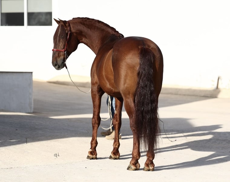 Caprichoso Mango is an exceptional chestnut stallion from the finest Bohórquez bloodlines, renowned for his expressive conformation, nobility, and outstanding movement quality. Grandson of the great Evento, he descends on both paternal and maternal lines from the legendary Albero II, ensuring proven genetics, functionality, and typicity in his offspring. This individual features harmonious conformation, strength, elasticity, and excellent movement. An ideal choice for breeders aiming to improve breed type, movement, and nobility, whether in Purebred Spanish horses or crossbreds. We offer fresh or frozen semen. Feel free to contact us for more information: info@pepeanton.com