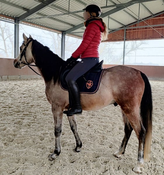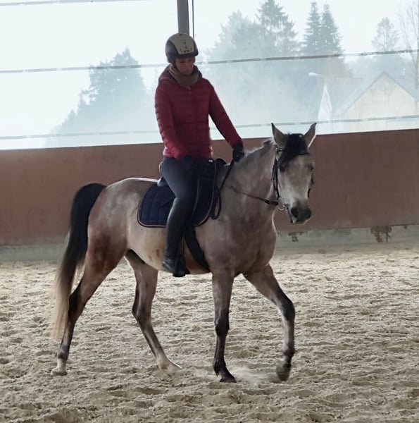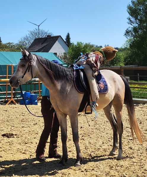 Nassim ist ein sehr menschenbezogener, wunderschöner und lieber Wallach. Ich habe ihn seit er 3 Monate alt ist. Er ist in einer guten Aufzucht groß geworden, mit Gleichaltrigen und erwachsenen Pferde. Nasim ist rangniedrig und geht Ärger lieber aus dem Weg. Wir haben 4 jährig (Frühling 2025) mit der Ausbildung begonnen. Kleinschrittig und achtsam ihm gegenüber. Bodenarbeit, Doppellonge, Riesenteddy als erster Reiter, dann erste Schritte unter dem Reiter... Er hat immer gerne mitgemacht und nicht ein einziges Mal gebuckelt. Danach hatte er einen Wachstumsschub und wir haben ihm eine Auszeit gegönnt. Jetzt haben wir wieder angefangen und er hat nichts vergessen. Im Gegenteil, er kann sich jetzt besser ausbalancieren. Zuvor sind wir mit ihm im Gelände spazieren gegangen und er ist ein sehr ruhiger und vertrauensvoller Araber. Er ist angeritten im Schritt und Trab und bei allem sehr brav. Nassim war von Fohlen an ein cooles Pferd und sehr verschmust!! Er bindet sich sehr an seinen Menschen. Leider bin ich für ihn zu schwer (nach Krankheit) geworden und ich habe Skrupel ihn zu reiten (auf den Bildern sieht man die Bereiterin). Deshalb habe ich mich schweren Herzens entschlossen, ihn doch abzugeben. Ich hoffe einen lieben Menschen zu finden, der mit seinen feinen und guten Charakterzügen fein und gut umgehen kann. Nassim hatte letzten Sommer "Bekanntschaft" mit einem Stacheldrahtzaun gemacht. Zum Glück waren keine Sehnen oder Knochen betroffen und es ist alles wunderbar verheilt. Er hat keine Schäden zurückbehalten, dennoch sage ich es dazu. Wer ein durch und durch liebes Pferd haben möchte, eines das gerne mitmacht, gerne lernt und für jede Kuscheleinheit froh ist, ist bei ihm goldrichtig. Ich könnte ihn mir sehr gut als Westernpferd vorstellen - oder zum Wanderreiten, oder einfach als tolles Freizeitpferd. Ach ja, fast vergessen. Er hat auch super Papiere, sein Opa ist der Weltchampion Versage, und und und - aber viel wichtiger ist doch, dass er ein wirklich toller Gefährte ist..